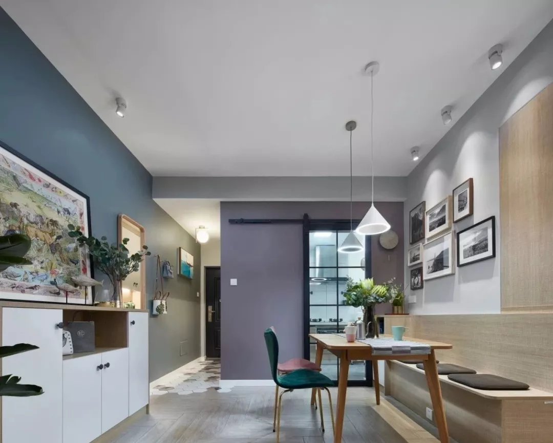 ▲过了玄关就进入了餐厅,紫色厨房墙面搭配黑色谷仓门,让餐厅空间有着更加灵动的交流。