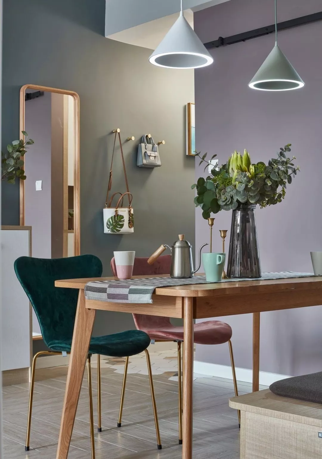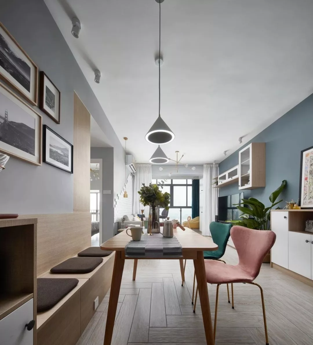 ▲原木质感的卡座与原木餐桌搭配和谐自然,餐桌上方的两盏灰白配的锥形吊灯,结合餐桌上的花饰与小饰品,一绿一粉的餐椅,带来了情趣优雅的空间感。