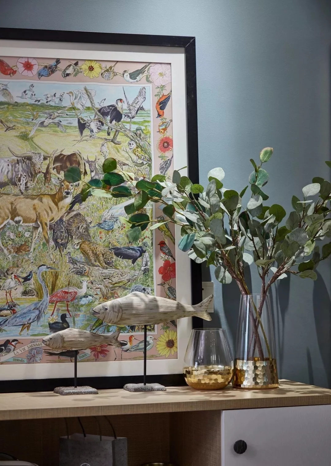 ▲过道靠墙一个矮柜餐边柜,摆上装饰品与一幅油画,为空间带来了精致的情趣感。