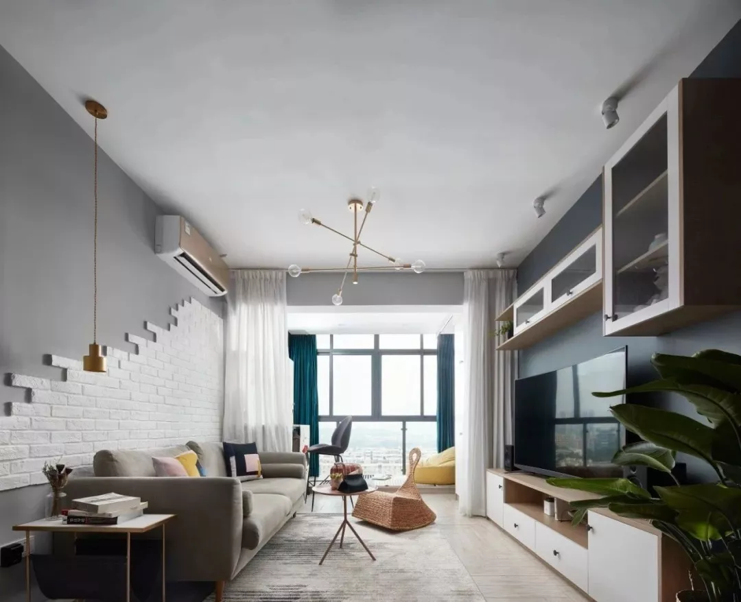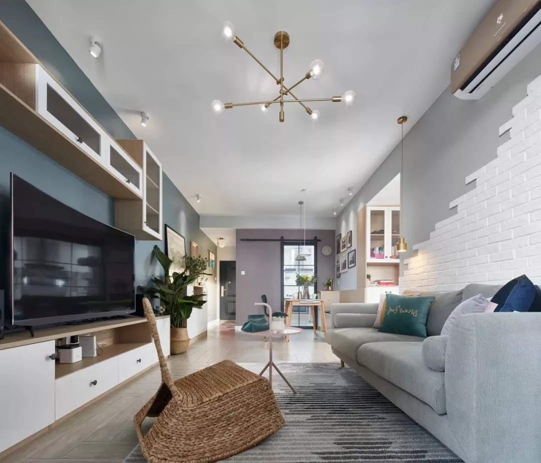 ▲客厅的电视墙背景色与玄关的灰蓝色保持一致,电视柜旁边一盆绿植,结合白色的电视柜与吊柜,带来了一个清新文艺的视觉感。