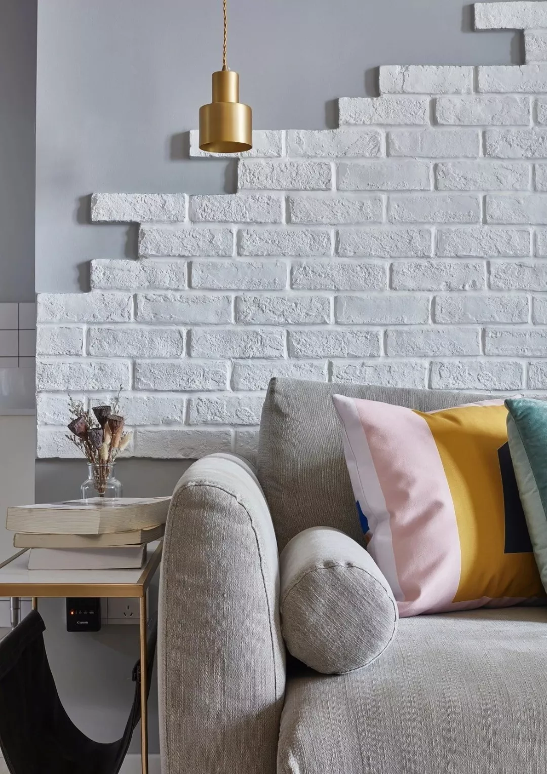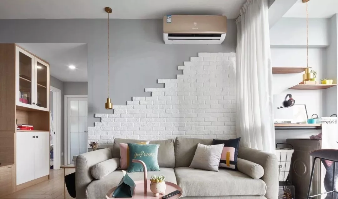▲沙发墙以白色文化砖+灰色墙漆的简单造型,暖灰色的布艺沙发上布置着粉、绿调的抱枕,显得文艺而又清新。