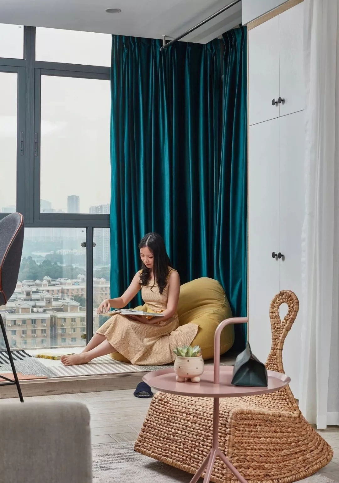 ▲阳台客厅打通的基础稍作抬高,成为空间里一个闲适的休闲区。