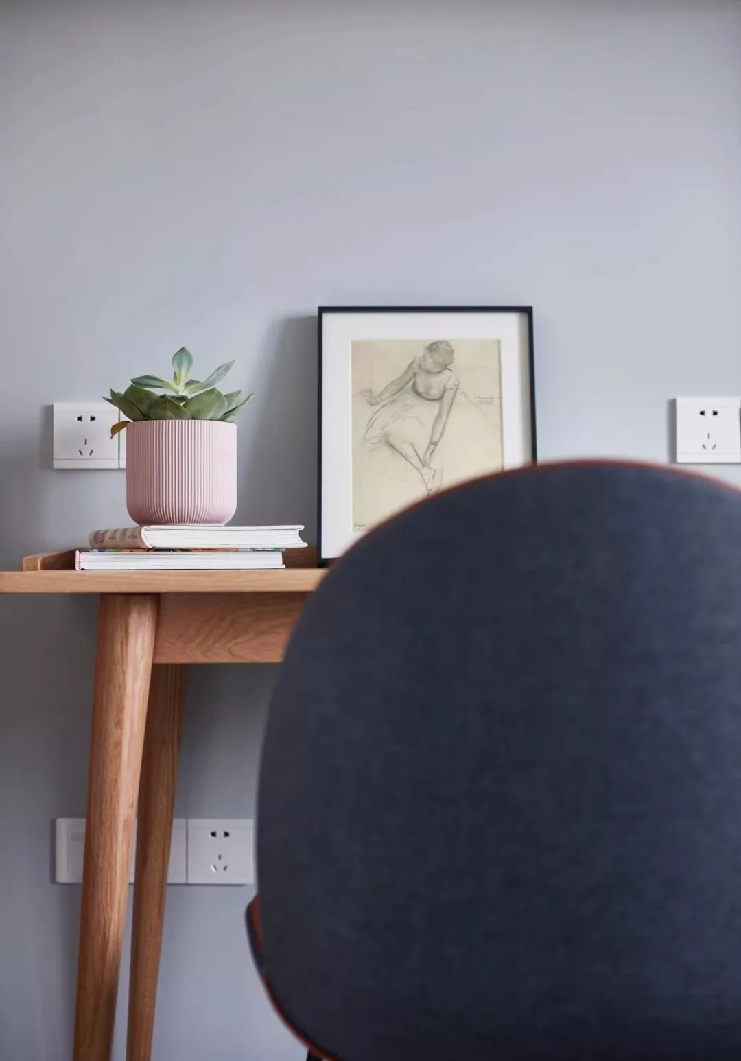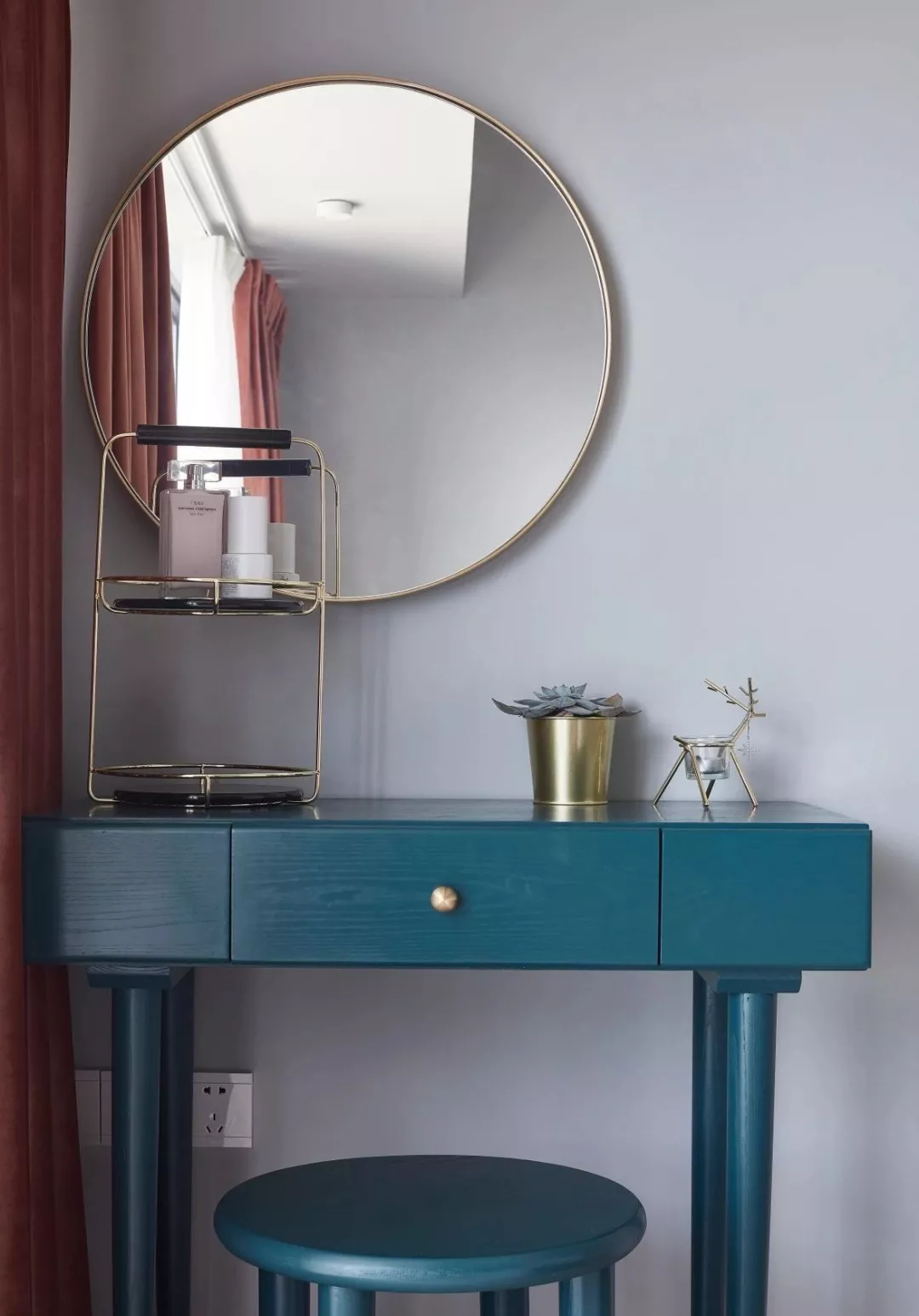 ▲床尾处摆了一个墨蓝色的梳妆台,金属摆件与镜框,搭配粉色的窗帘,温情高.档。
