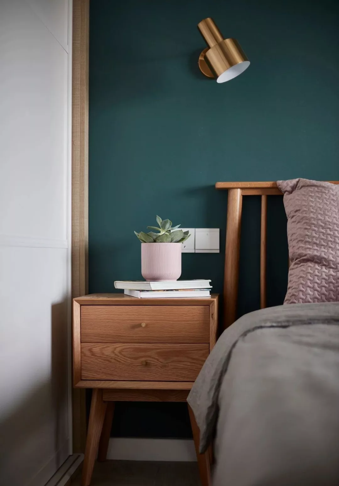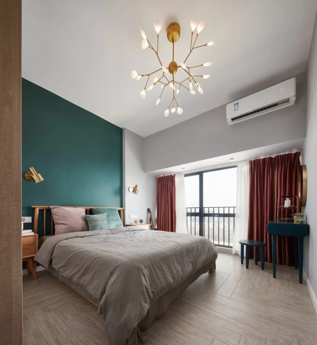 ▲墨绿色的床头背景墙,木质床搭配上灰色床单,一盏花枝般的吊灯挂在上方,整体显得安静而又简约,让人轻松舒服。