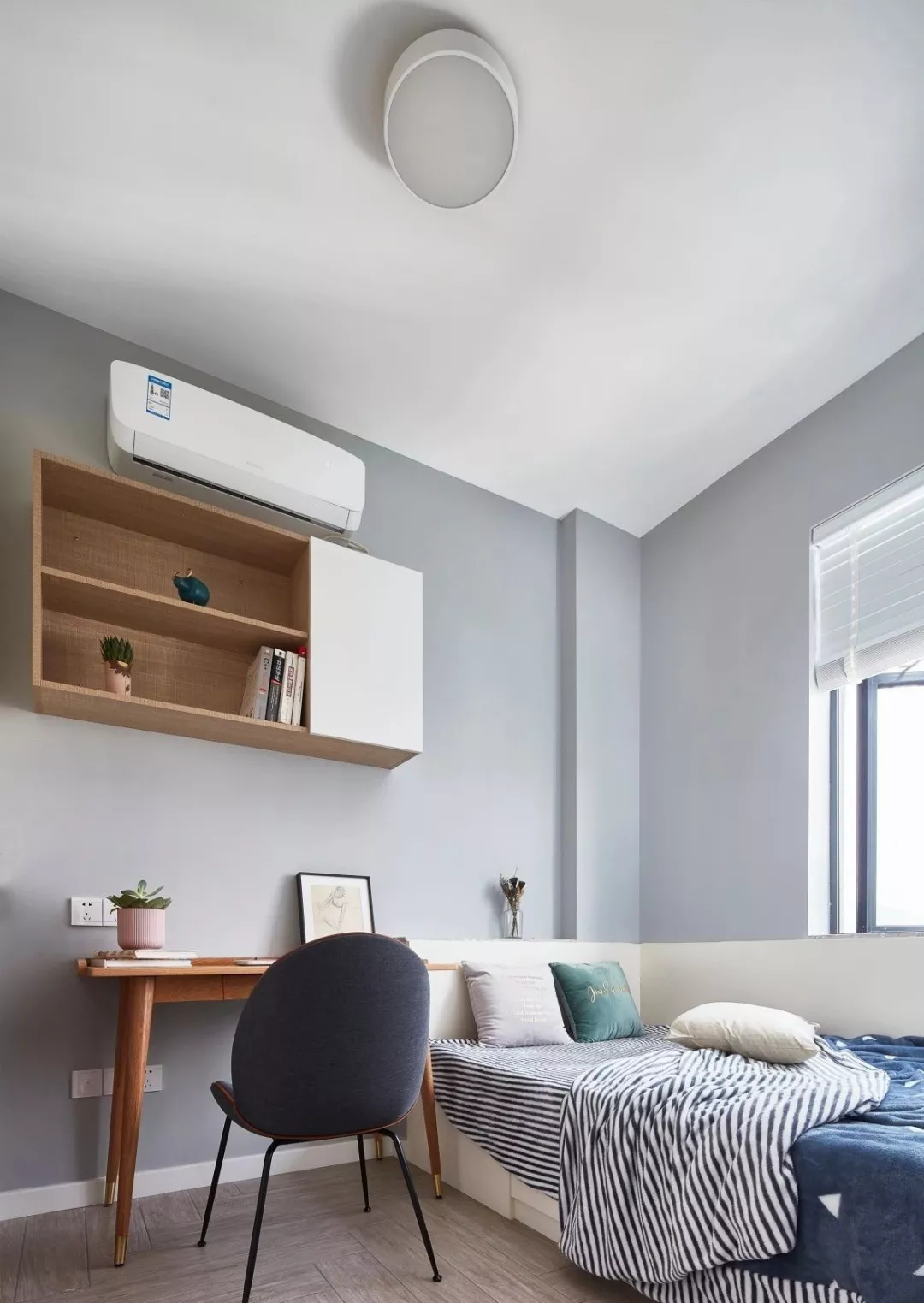 ▲儿童房靠窗摆放一张定制床,蓝白配的床单,轻松自然。床侧边一张书桌与吊柜书架,也为孩子提供了个舒服的写作业看书的位置。