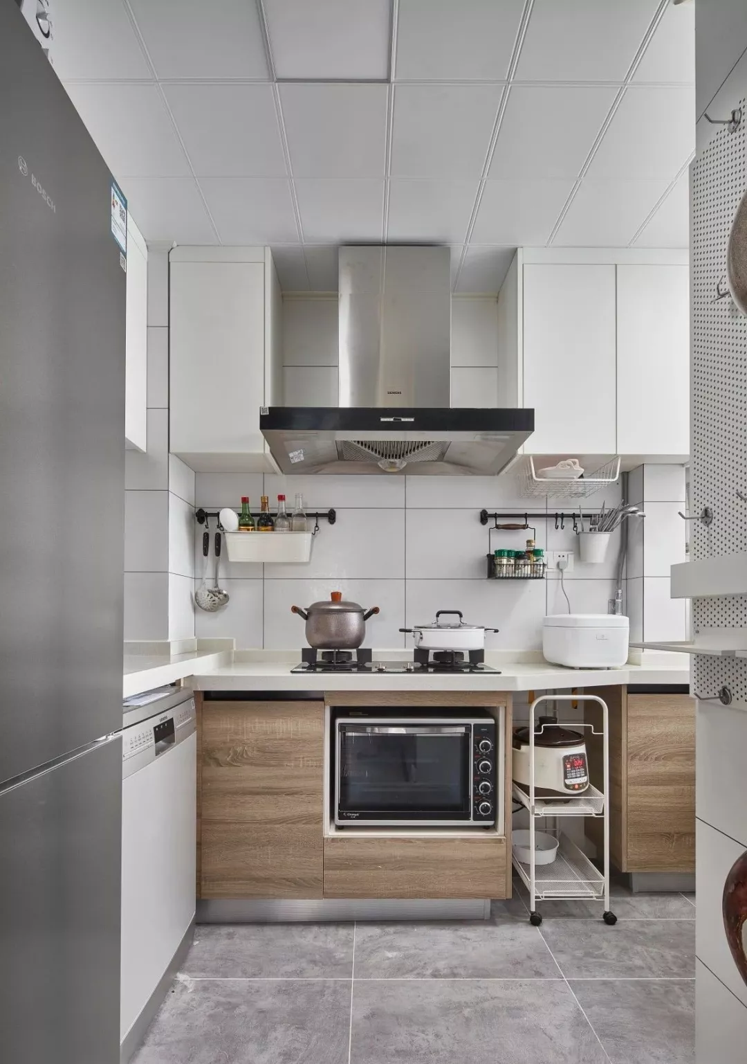 ▲精致的小厨房,巧妙地把各类电器嵌入到橱柜里,还放了一个移动式的料理架,在灰色地砖、白色墙砖与木质橱柜的搭配下,让做饭的心情都轻快。