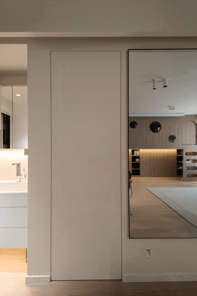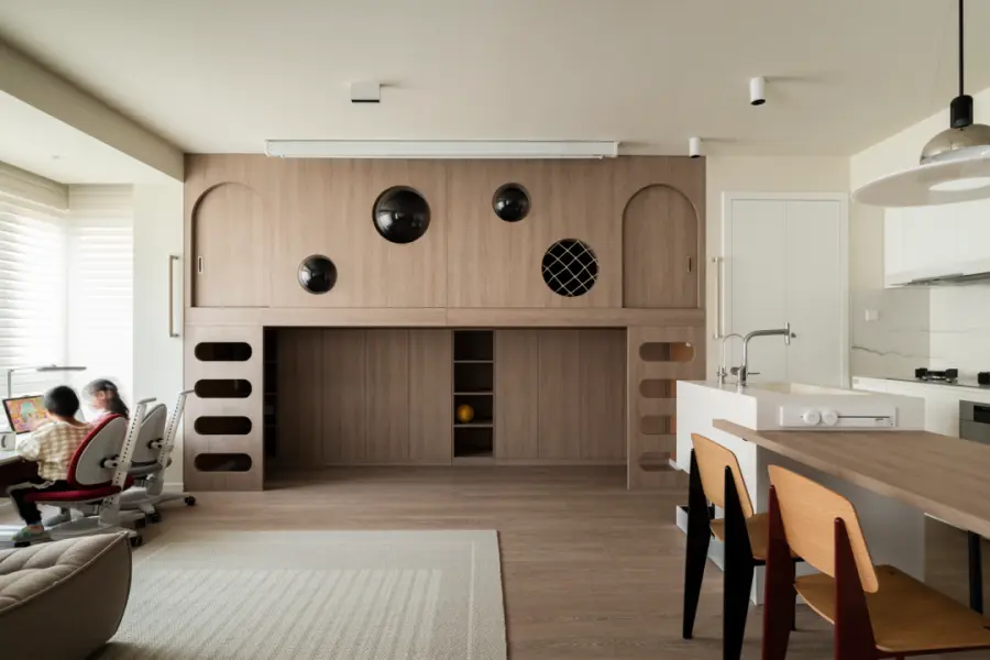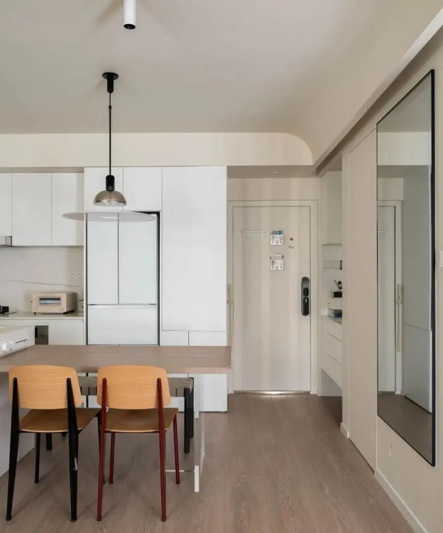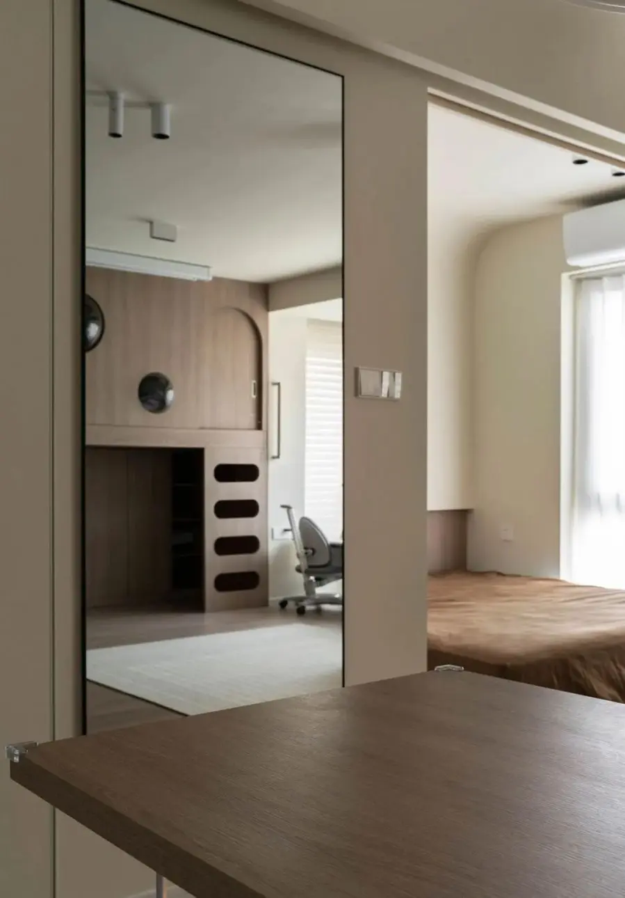 ▲ 小朋友在学舞蹈,所以公区也承载着一部分舞蹈室的功能,在玄关进入室内的动线上设置一面全身镜,既能方便出门整理仪容,也能作为小朋友的舞蹈镜