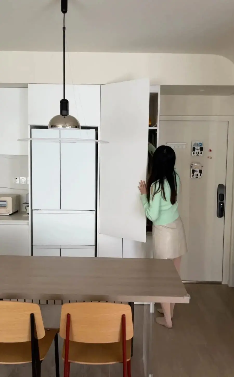 ▲ 为了方便做嵌入式冰箱,设计师将玄关柜的进深做到了600mm,这样一来,如果是正常的柜子取深处的物品是会有点吃力的,所以将玄关柜一分为二,做双面可打开的转角处理,面向餐厅一侧挂衣