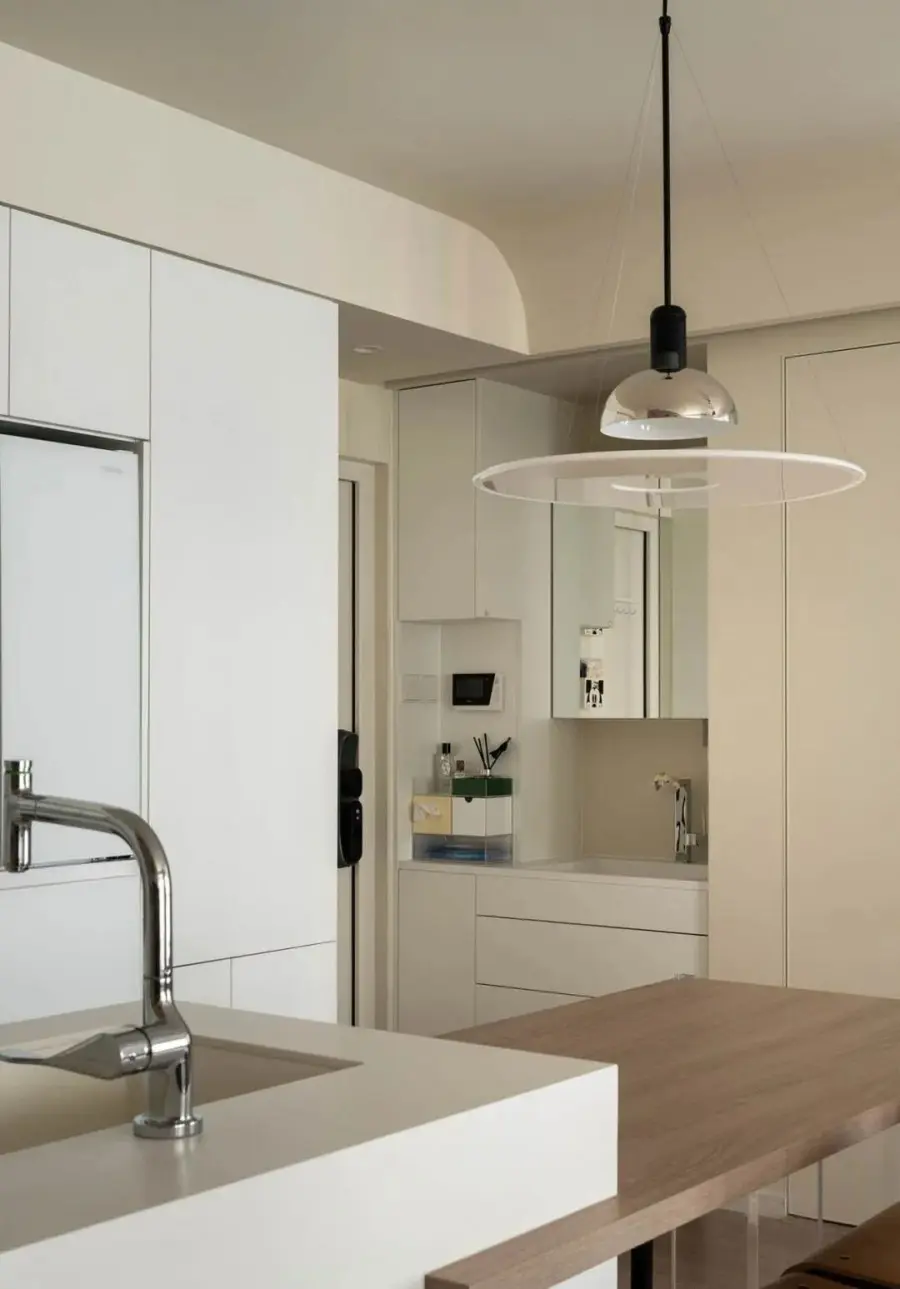 ▲ 玄关处新增的洗手台,一定程度上缓解了业主一家四口如厕“早高峰”的困扰,同时回家可以第一时间洗手消毒,洗手台左侧其实是管道井,设计师借势做了个储物空间,下方凹槽处留白,方便业主进门随手放置钥匙等小件零碎物品