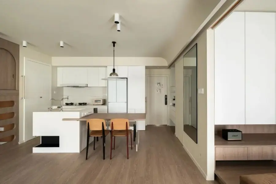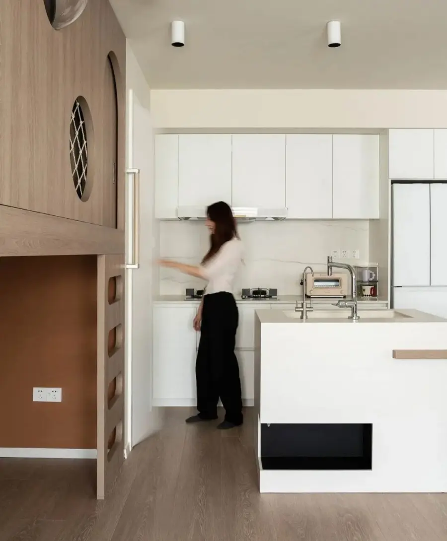 ▲ 原户型是没有玄关的,储物功能缺失,改造后将厨房打开,橱柜连通入户区,尽头利用转角柜新增鞋子、外套的收纳空间