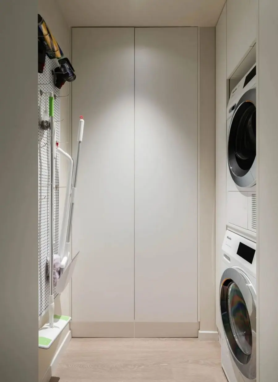 ▲ 洗烘衣机套装上下叠放更省空间,也解决了业主家没有阳台晾晒衣物的困扰,四周做储物柜,用来收纳洗衣液,墙面利用洞洞板将常用的清扫工具壁挂收纳,高效利用纵向空间,不浪费每一寸面积
