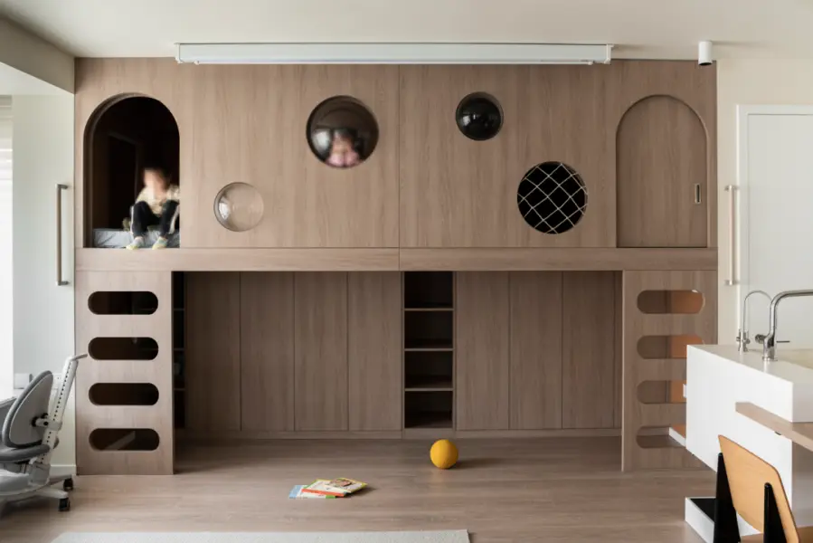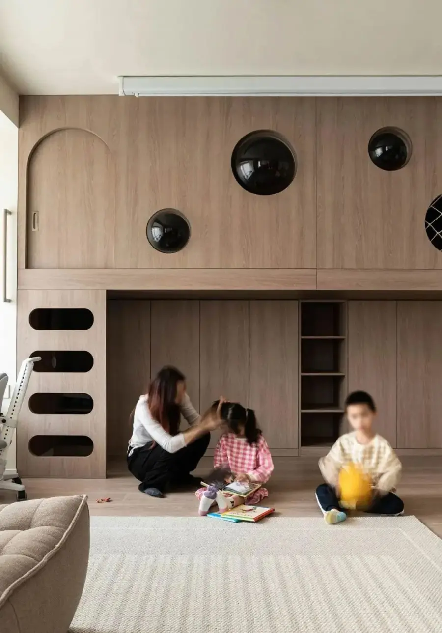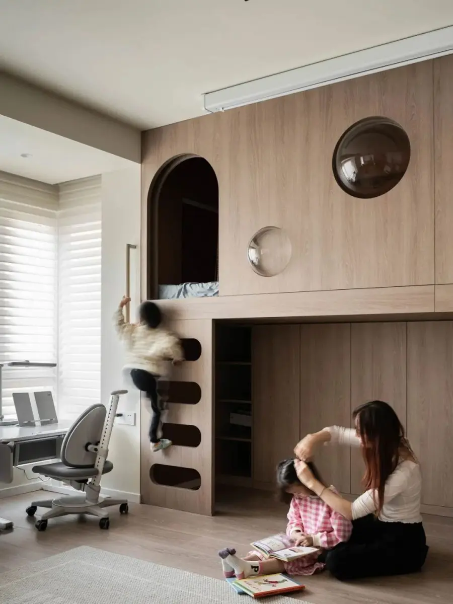 ▲ 面积有限,所以儿童房的设计引入了“睡眠舱”的概念,在原储物间的位置改出了两个1.2米X2米的独立小房间,房间左右两侧分别设置入口,中间是隔开的,独立又亲密,两个房间还特意留了“小机关”,增强互动性的同时也方便通风透气