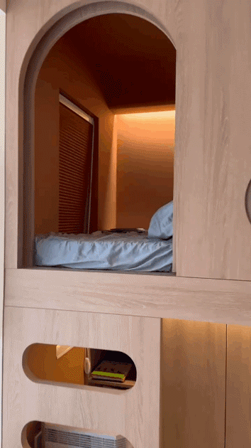 ▲ 睡眠舱内直接铺床垫,空间内部设置灯带及独立开关,左侧是透风窗