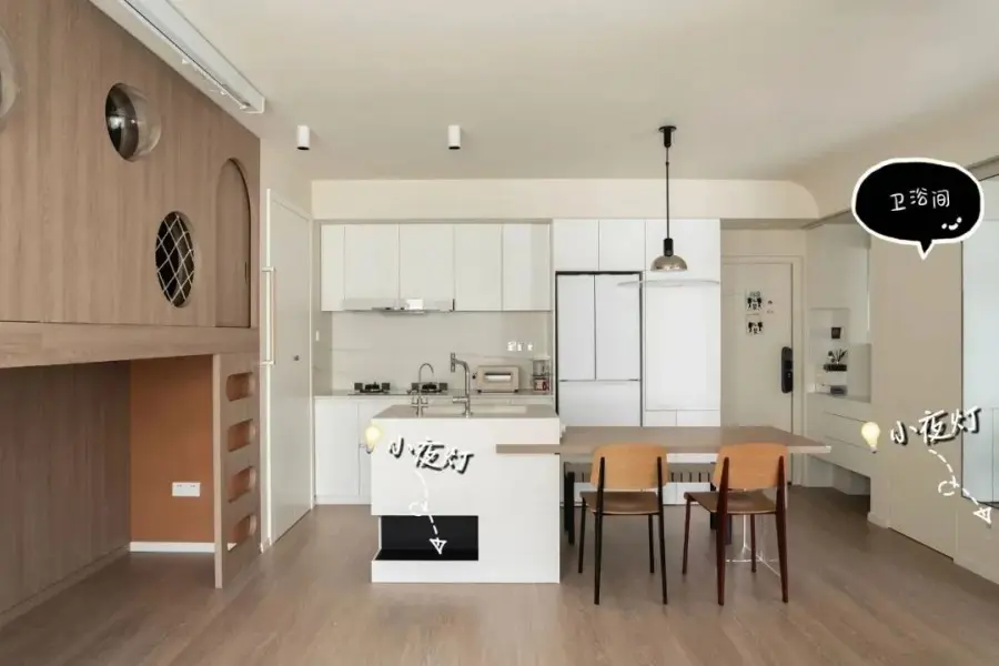 ▲ 儿童房的起夜动线会途经餐区和岛台,设计师在岛台下方以及卫浴间门口分别做了感应小夜灯的设计,夜间起夜即便不开全屋照明也能看清路