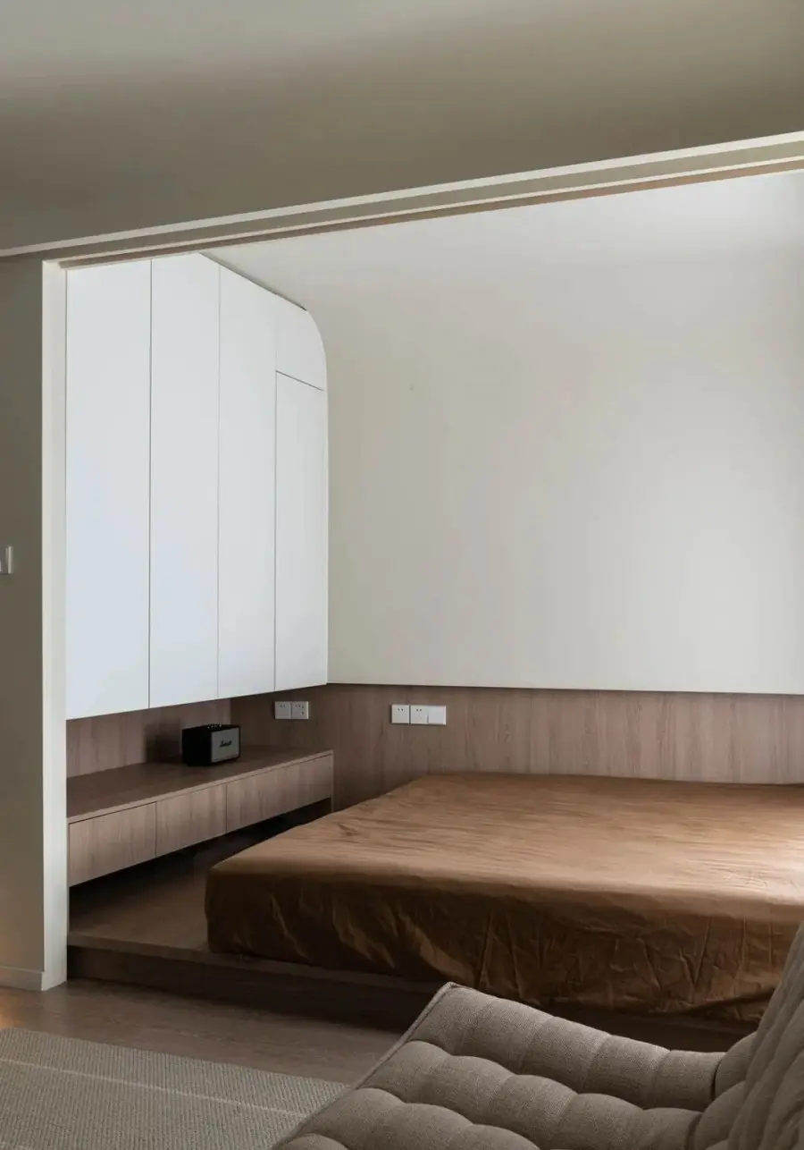 ▲ 儿童房对面就是主卧,为了节省空间,地面做了抬高处理,以地台床代替普通床架,靠墙位置顺势作衣柜储物,柜体下方预留开放式储物格代替床头柜,方便睡前收手机、书籍等物品