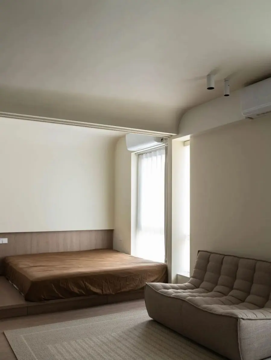 ▲ 卧室入口上方是结构横梁,利用弧形顶面造型,在公区没有吊顶的前提下将格局缺陷巧妙遮挡,考虑到2岁的男宝年纪小,为了方便照顾,主卧目前暂时做开放式处理,提前预留了推拉门轨道,后期能随时切换独立卧房
