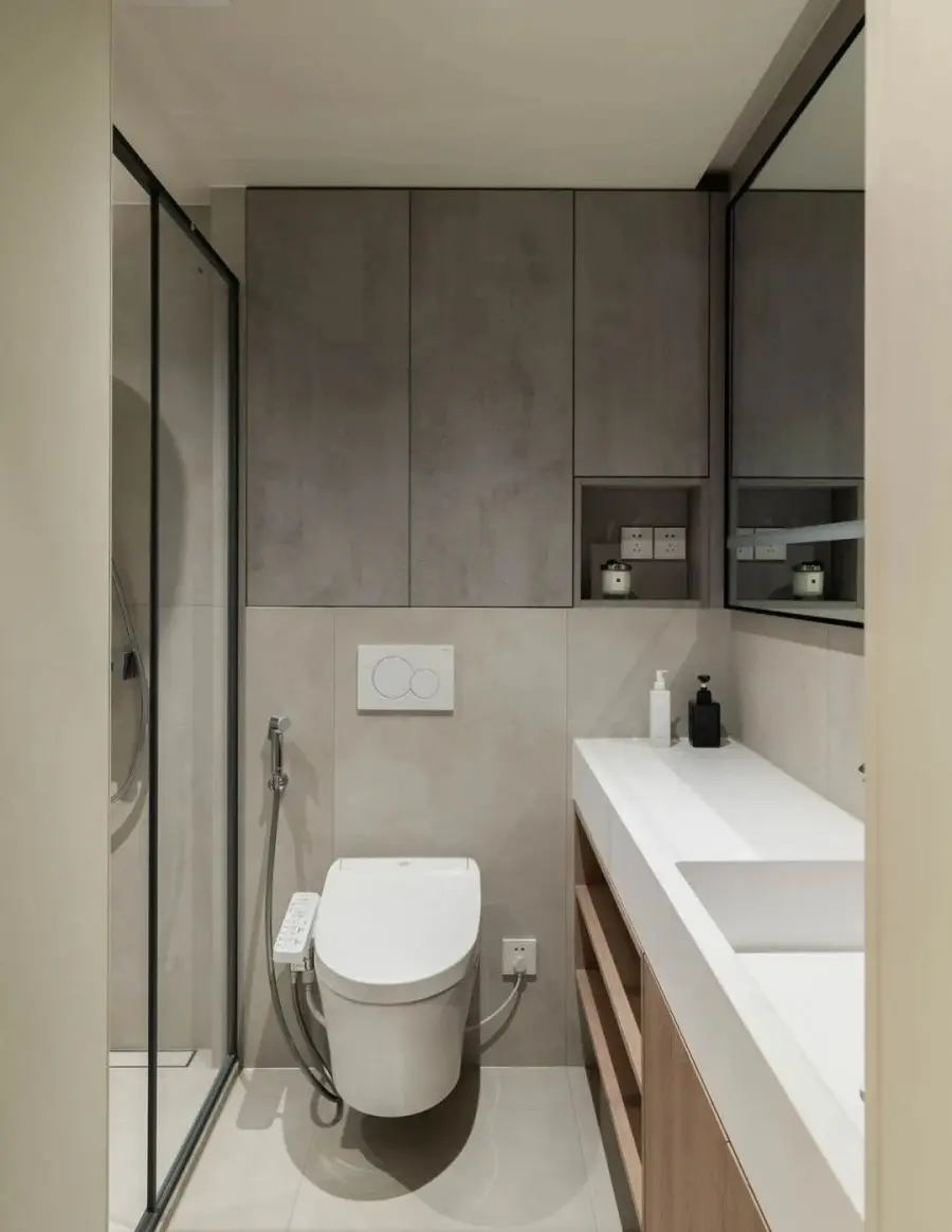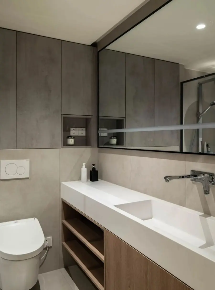 ▲ 利用壁挂马桶水箱上方空间做储物柜,方便清洁剂等消耗品囤货;1.8米超长洗手台一直延伸至马桶区,台面下方作开放格,方便厕纸存放;设计壁龛并预留插座,方便剃须刀存放充电