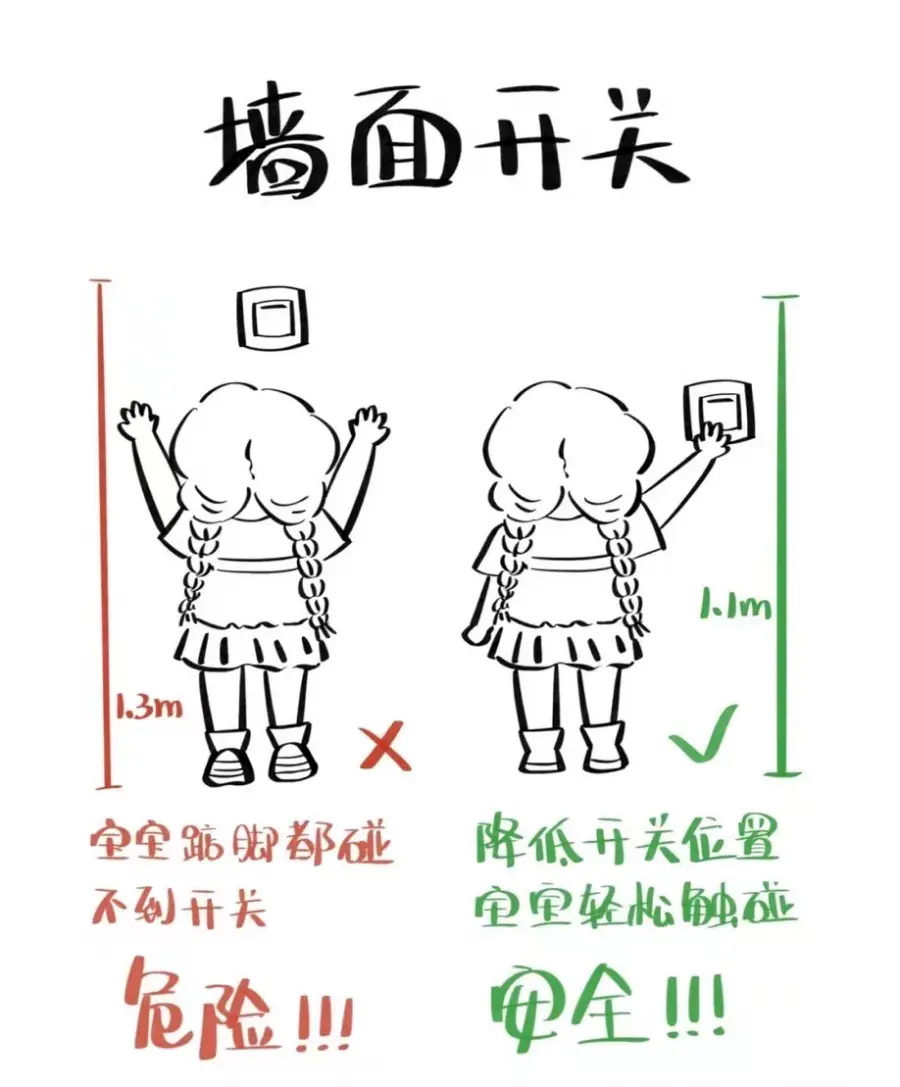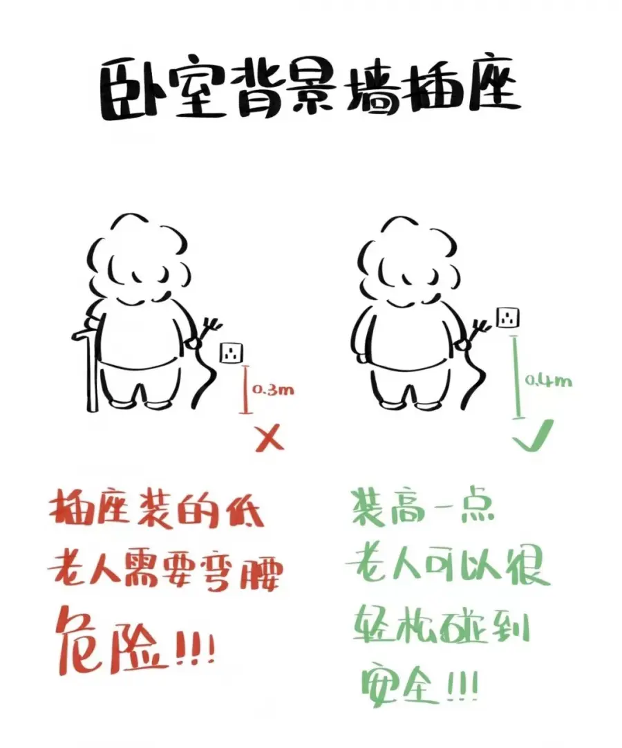建议把插座位置从正常的0.3m处调整到离地面0.4m处,老人就可以轻松插座啦~