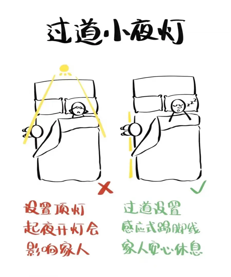 如果在床下和过道安装感应式的小夜,不影响家人的同时还可以清晰的看到周围的路线,灯光也会柔和非常多。