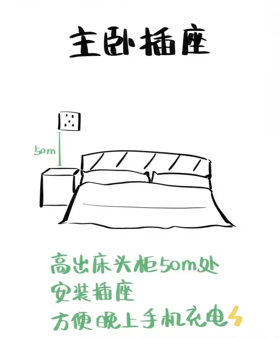 在高出床头柜50m处设置五孔插座,晚上在床边伸手就能触及。