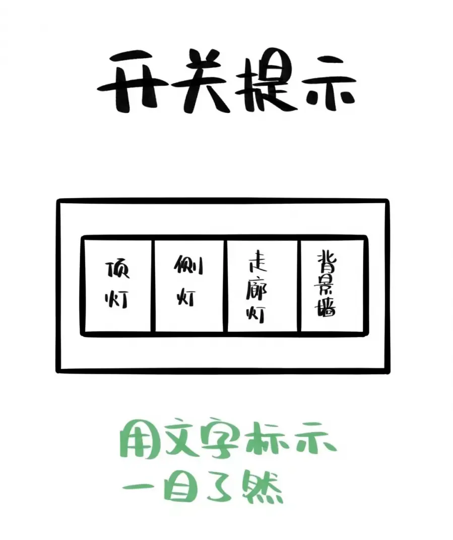 开关面板上,可以用文字标示开关相应控制区域,开哪个灯一目了然。