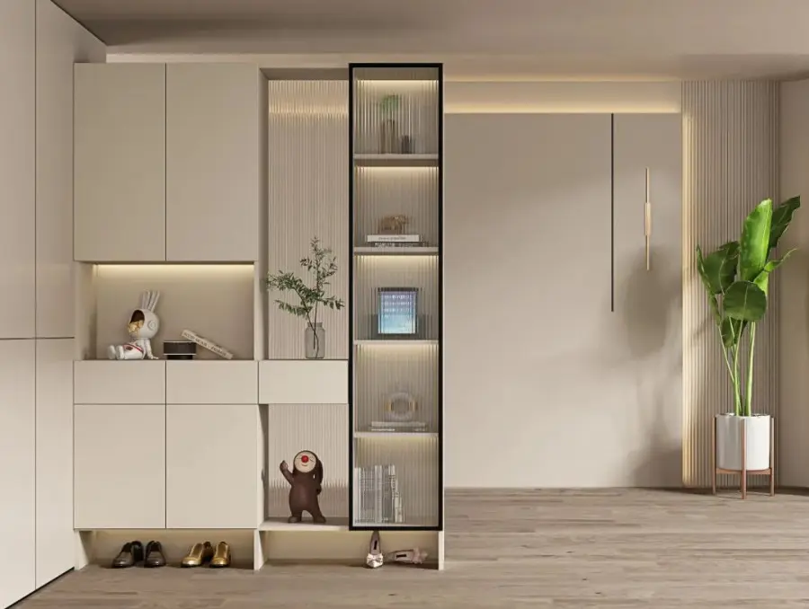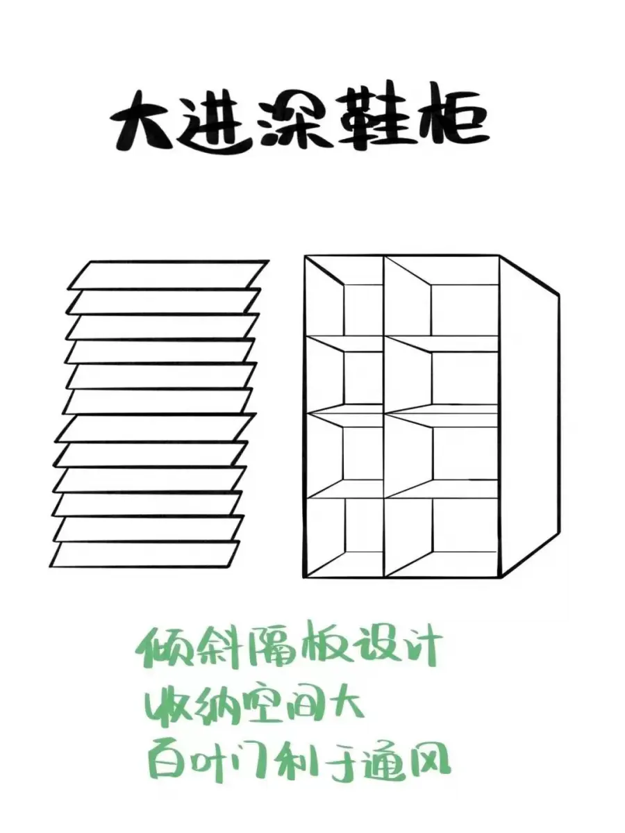 多隔层、大进深、倾斜隔板设计的鞋柜收纳空间更大,另外玻璃砖的透光性更好。