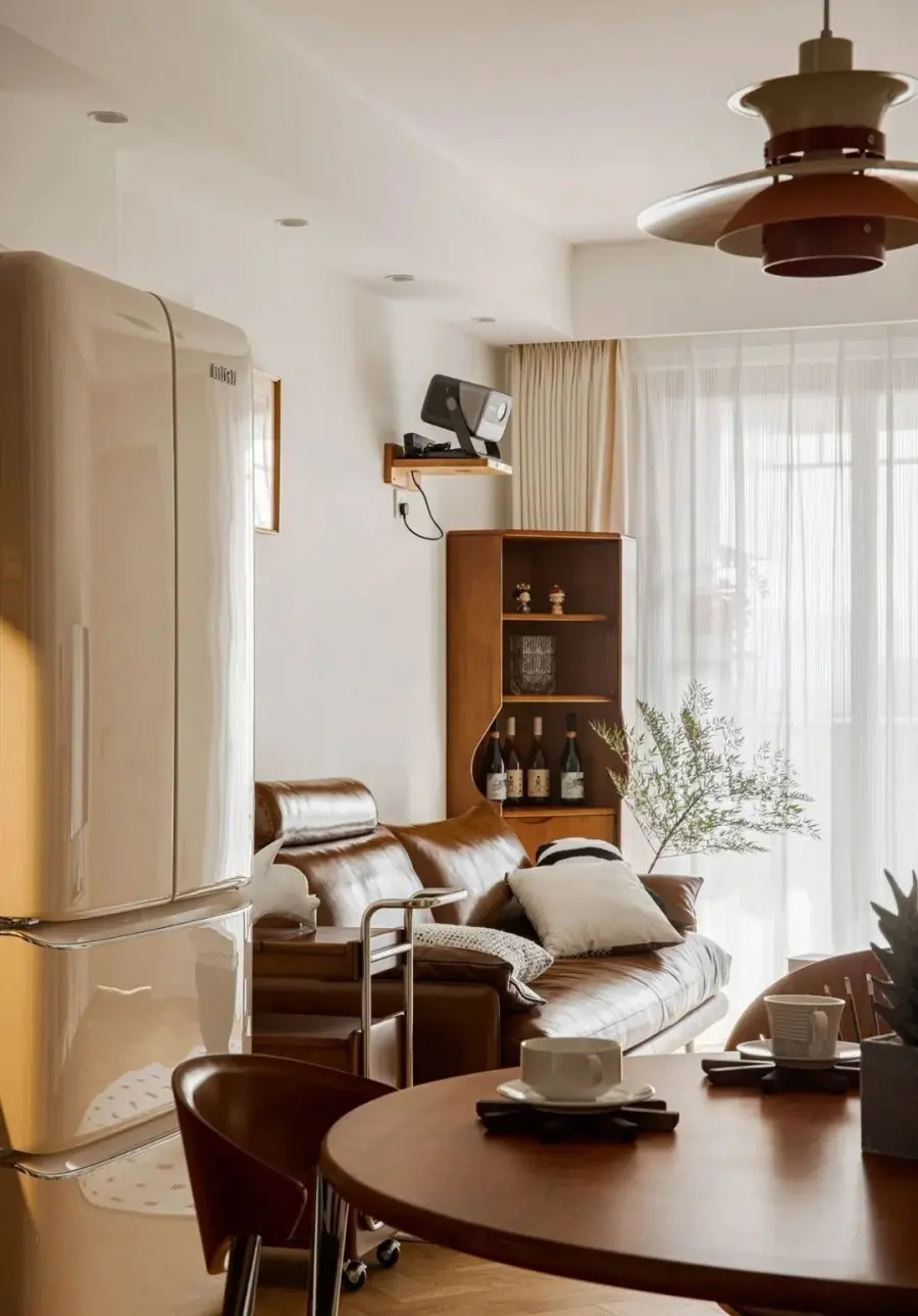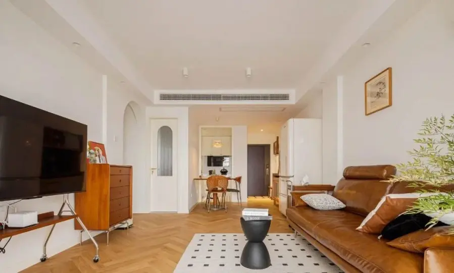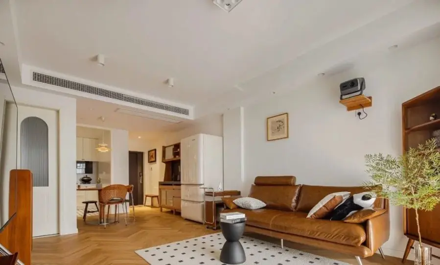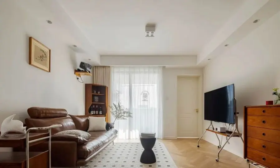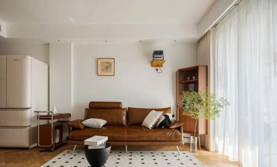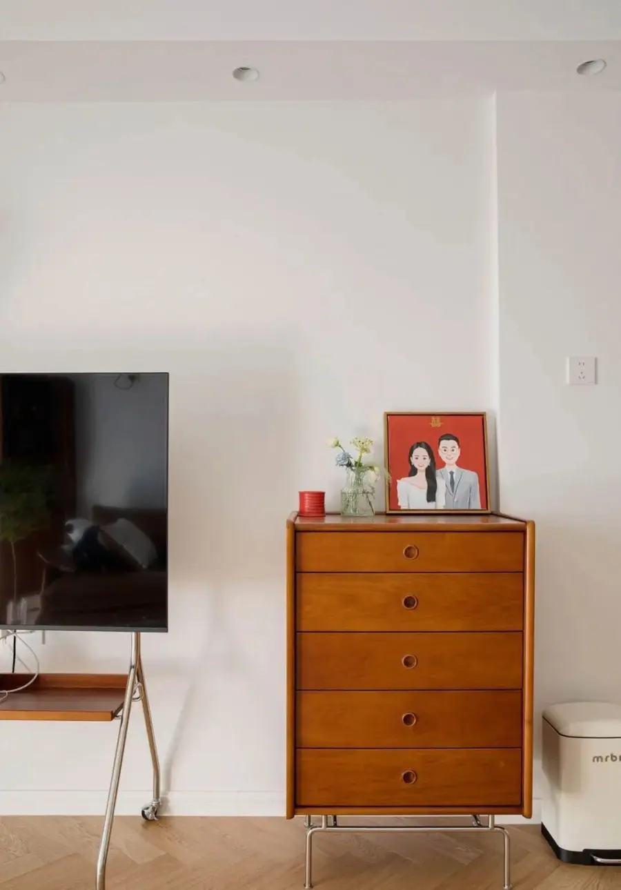 ▲ 胡桃木系列家具占据了客厅边边角角,在白色硬装基底下,显得沉稳有温度