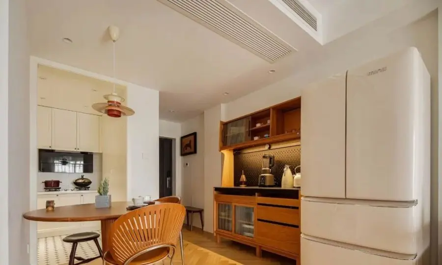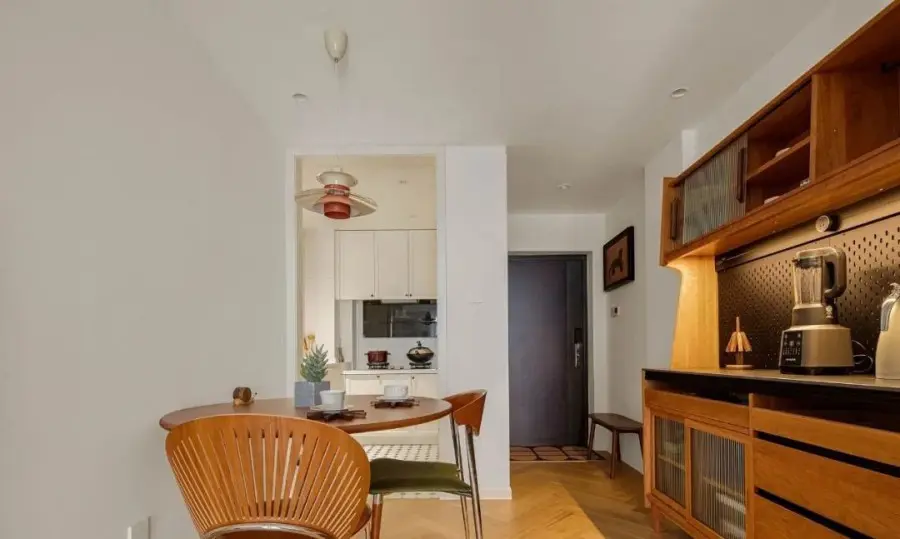 ▲ 圆形餐桌椅靠墙摆放,留出足够的过道空间,一旁的成品餐边柜收纳着各种杯子、餐具、家电等