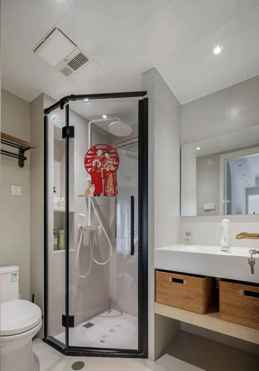 ▲ 卫生间,悬空台盆下方设计层板搭配收纳筐使用,更加方便实用,淋浴区墙面利用包管厚度增加置物壁龛