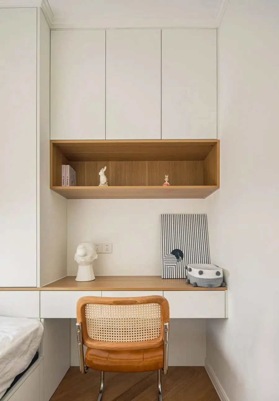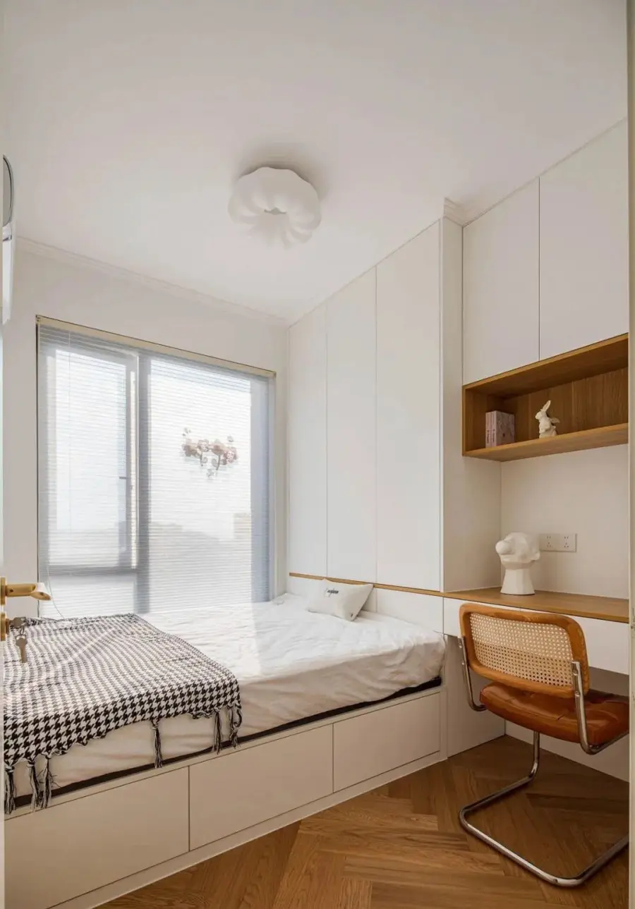 ▲ 次卧,定制榻榻米集衣柜、书桌于一体,这里暂时作为书房使用,以后作为儿童房