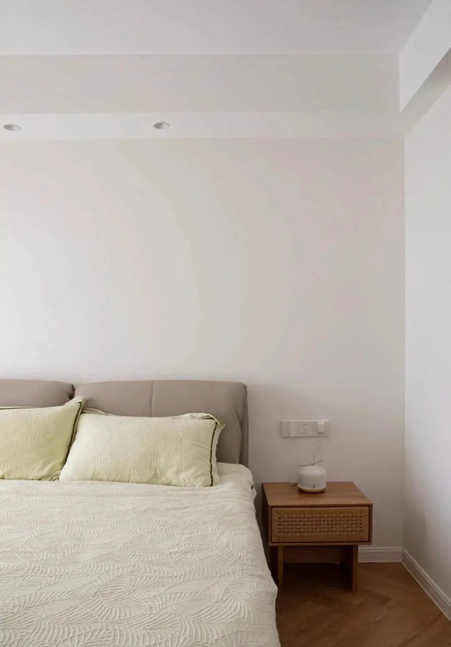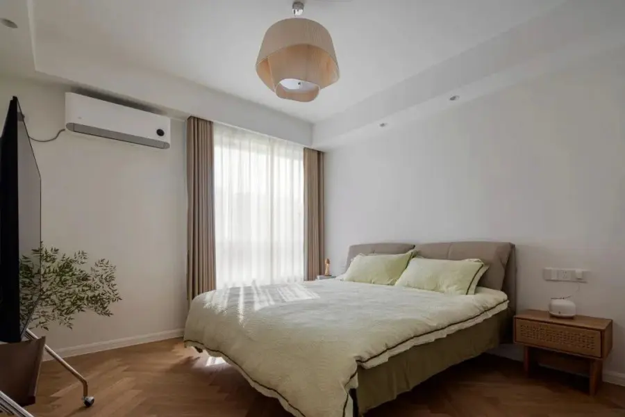 ▲ 主卧延续公区格调,布艺主灯文艺复古,电视架可灵活移动,客厅卧室都可以是观影场景