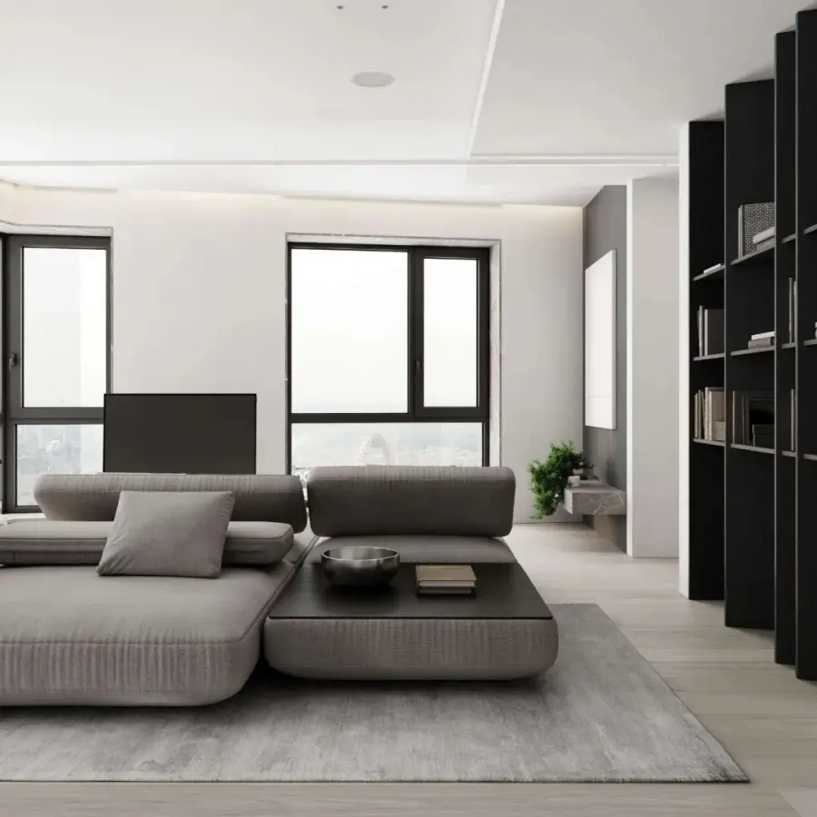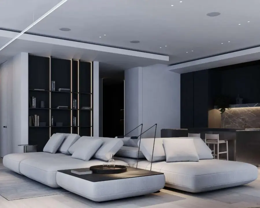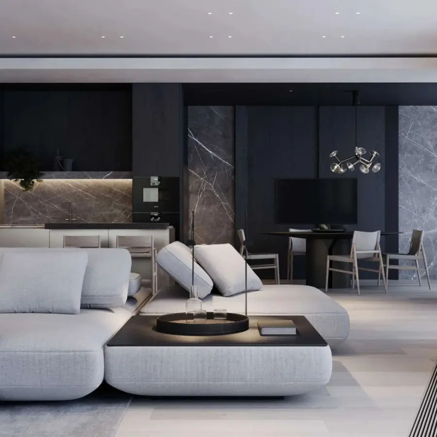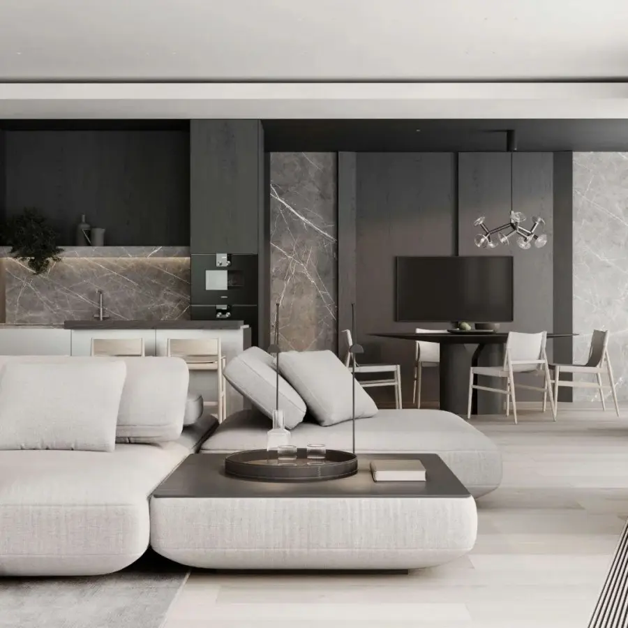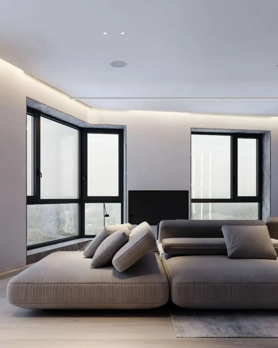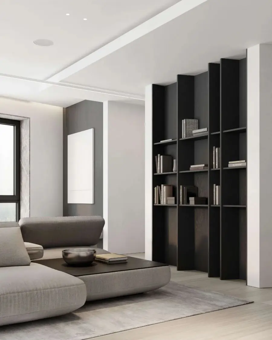 布艺沙发极具质感,空间的深浅色系之间衔接自如,增添视觉层次。体块与材质变化应对空间的功能划分,彰显几何秩序之美。