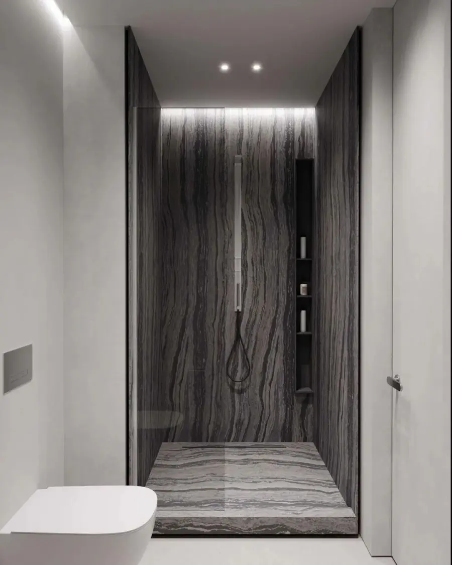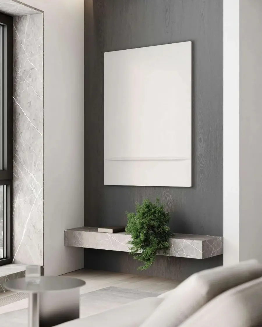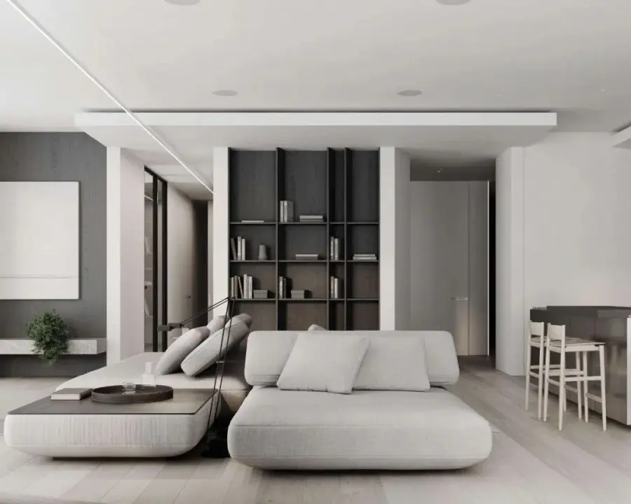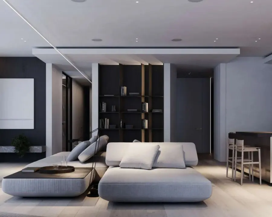 灰白的底色中,温润木材元素构建起冷暖平衡的空间韵律,再加上材质和灯光的运用凸显,使整个公寓质感与舒适度得到结合。
