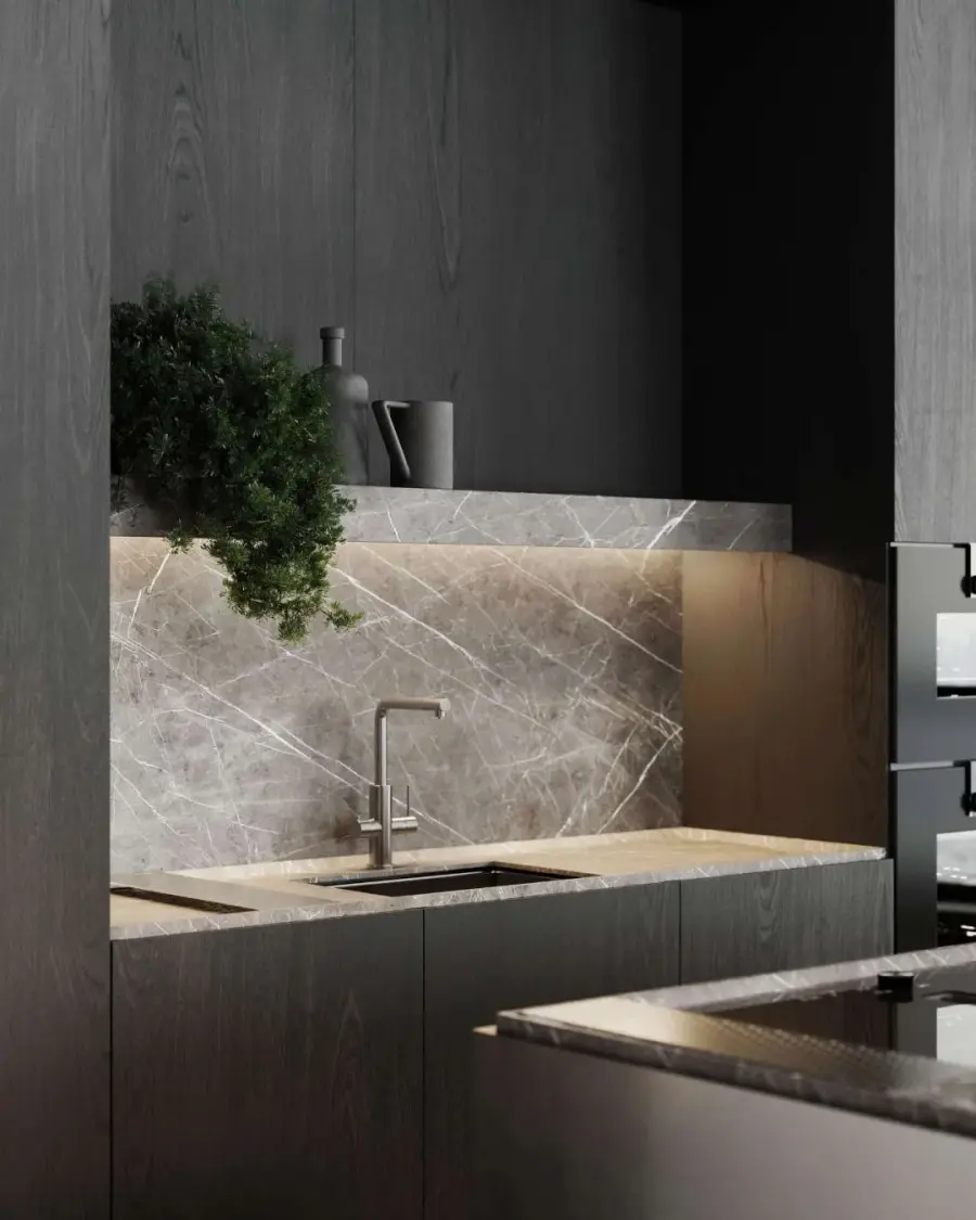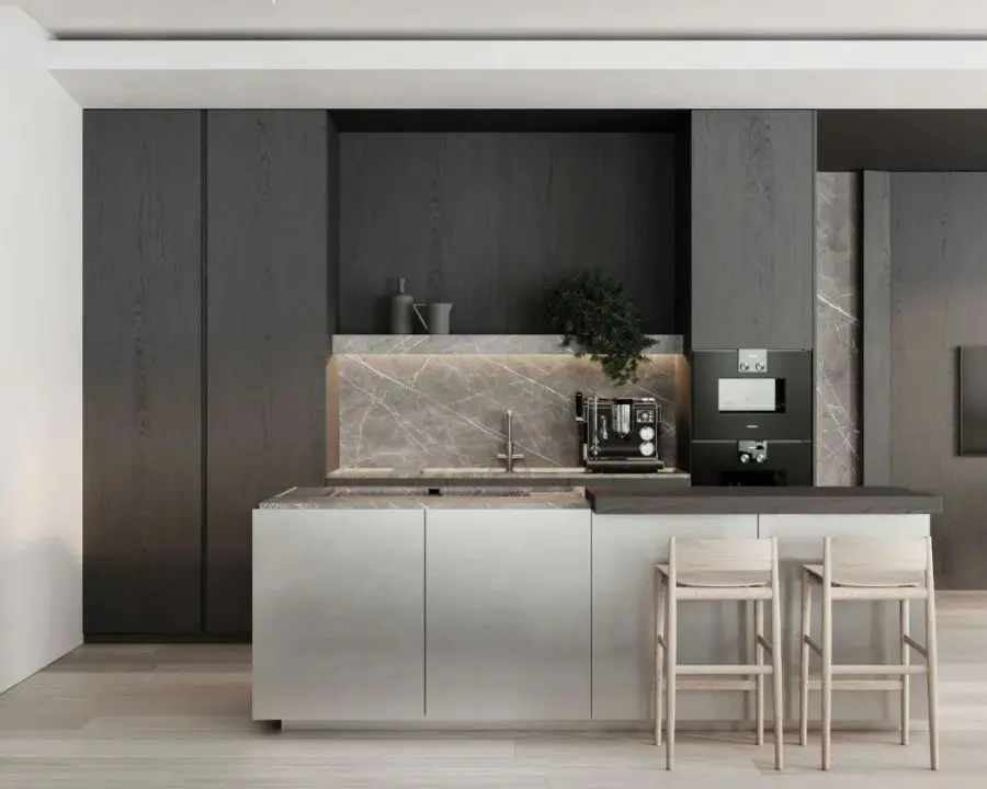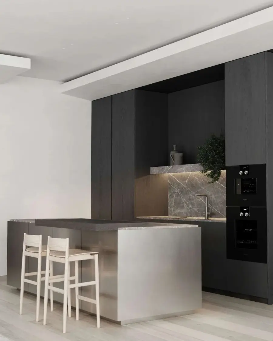 一字型厨房布局,一体式橱柜将所有电器嵌入柜体,保持了统一的现代风格。