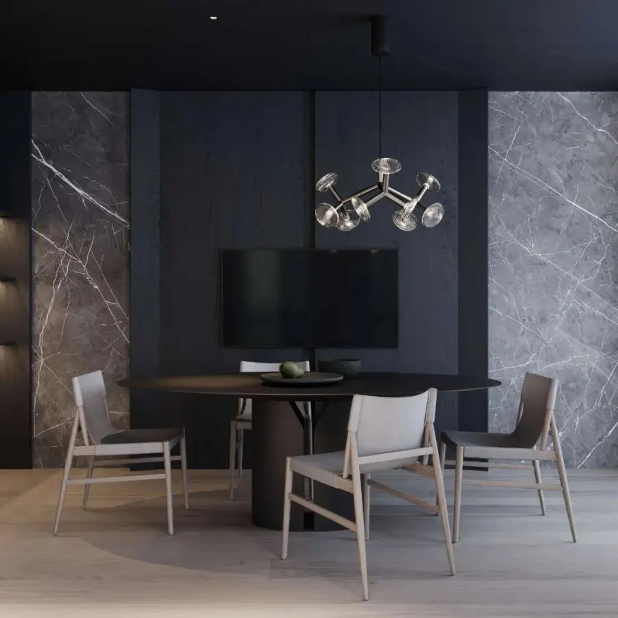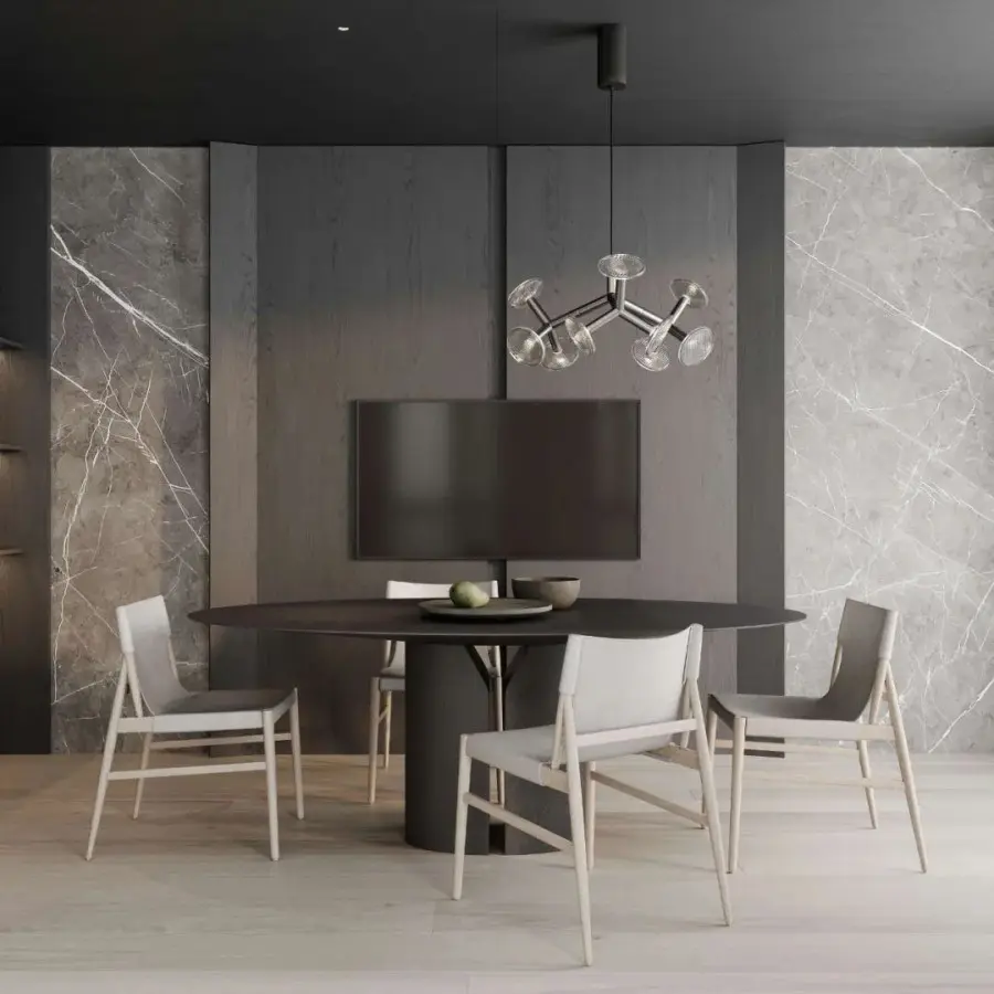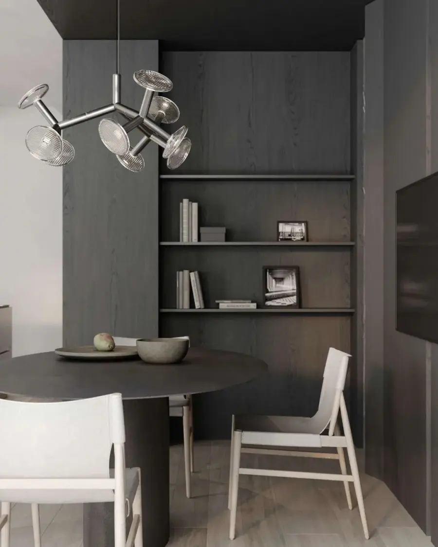 餐厅选择了圆形餐桌、简约的明式餐椅、现代造型灯具,旨在让饮食更有仪式感,互动时增添情趣。