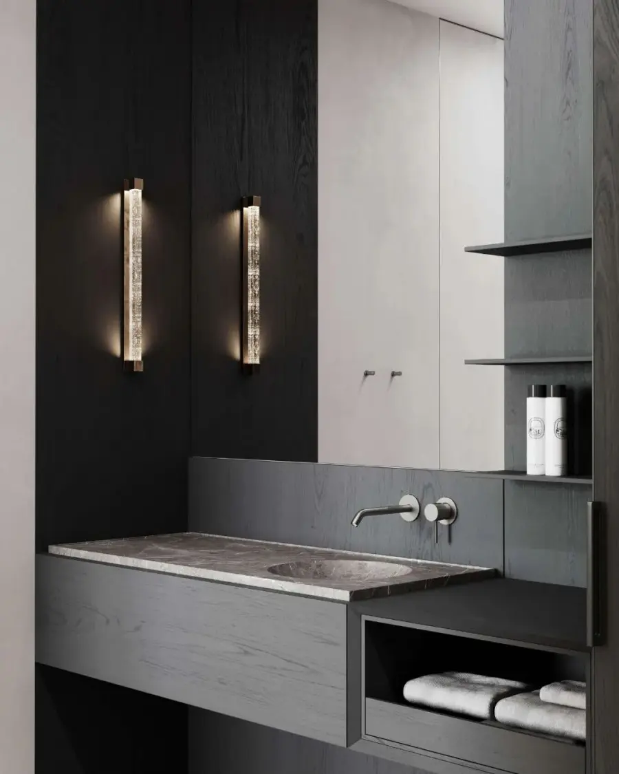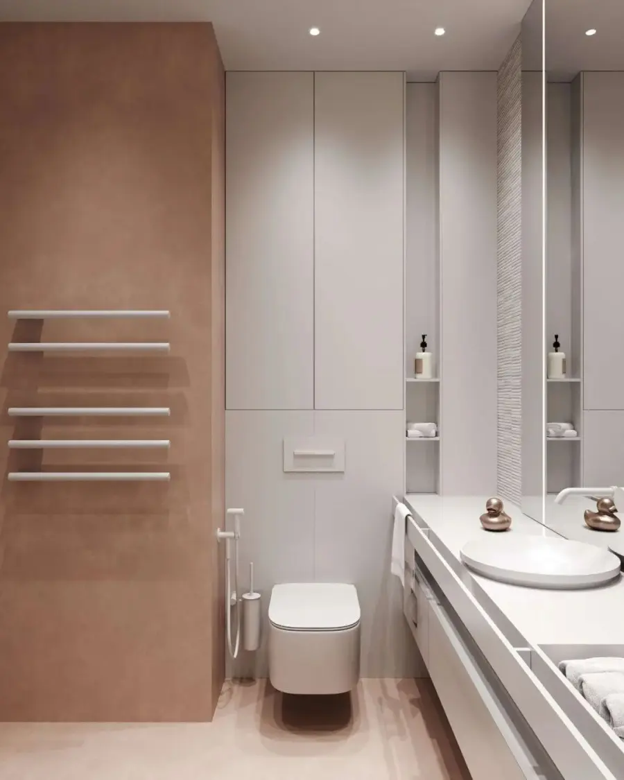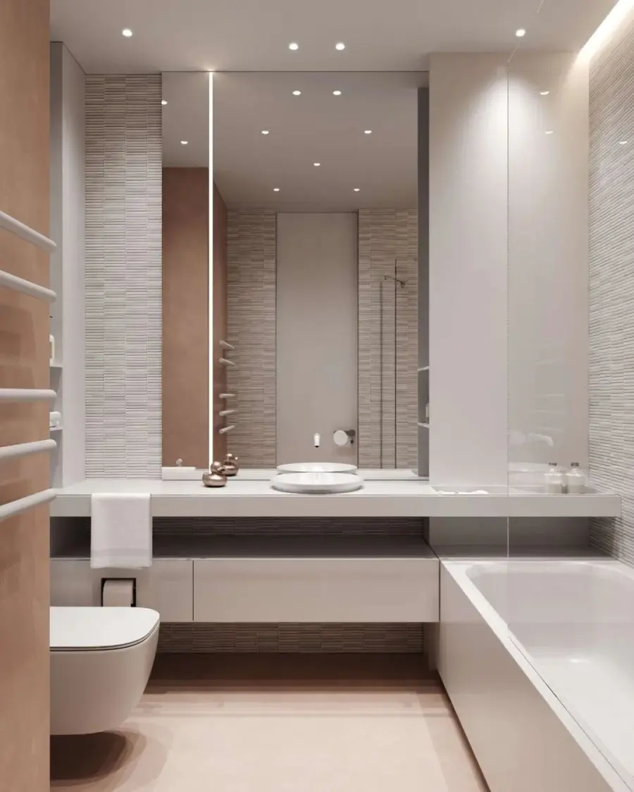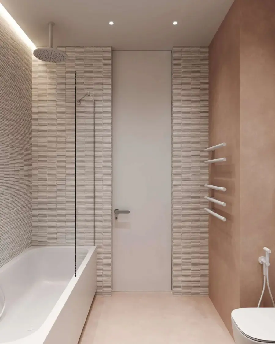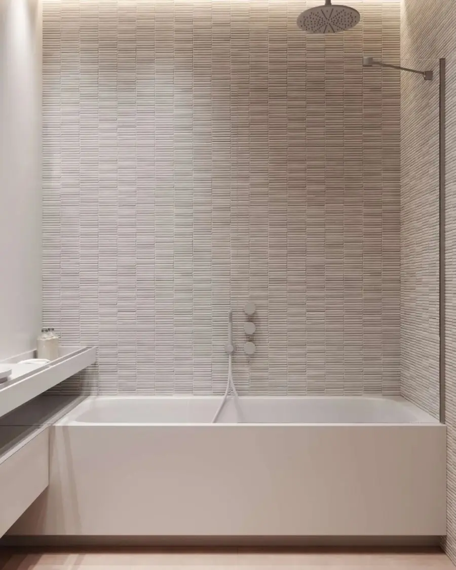 卫生间大面积条形状的磁砖铺贴,运用暖色的搭配,融入简约舒适的设计手法,空间雅奢兼备,纯净且充满自然灵动。