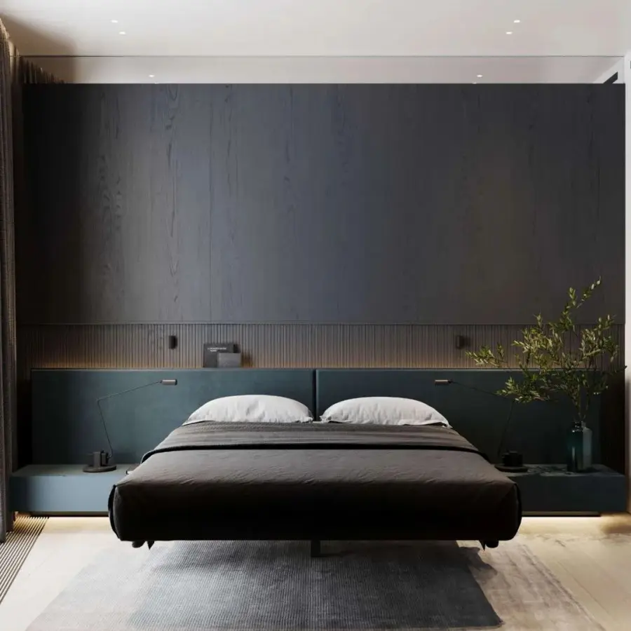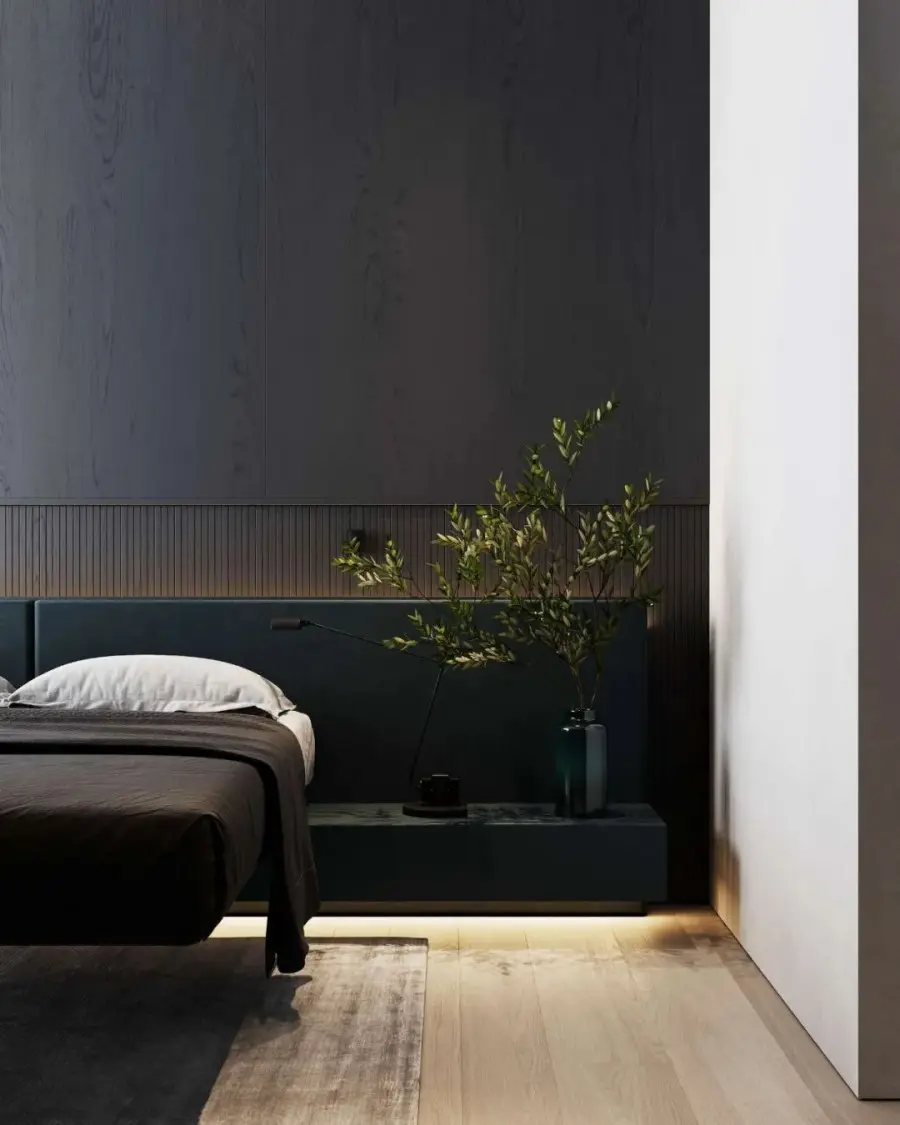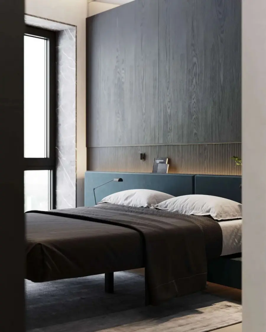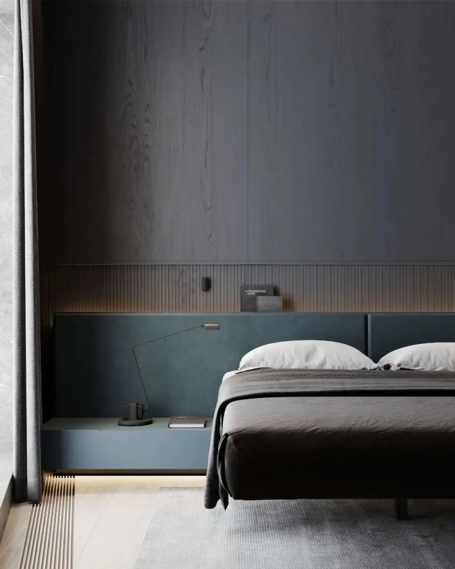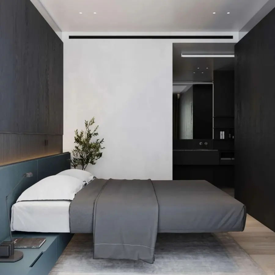 主卧奢华而不浓重,优雅而不浮夸,延续空间低饱和度的中性色调。时尚、简洁而又不失质感,演绎了新的都市生活美学。