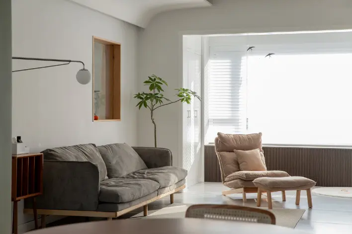 客厅主打一个字“大”,地面采用900*900规格的地砖,视觉效果简洁大气。墙面和顶面保留原始面层处理,大面积白色让空间更开阔。