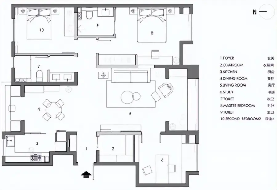 平面布置图:整体改动有四处,首先把进门处带阳台的房间一分为二,设计成书房和衣帽间,其次将主卧阳台封进室内,扩大主卧使用面积。