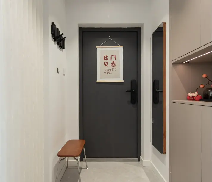 门厅简单的设计,满足基础功能又耐看。除了鞋柜之外,通过改造得到衣帽间,为了降低厚重感,改用白色折叠门设计,拉开折叠门各种鞋盒、衣服、雨伞、玩具都可以放得下,非常便利。