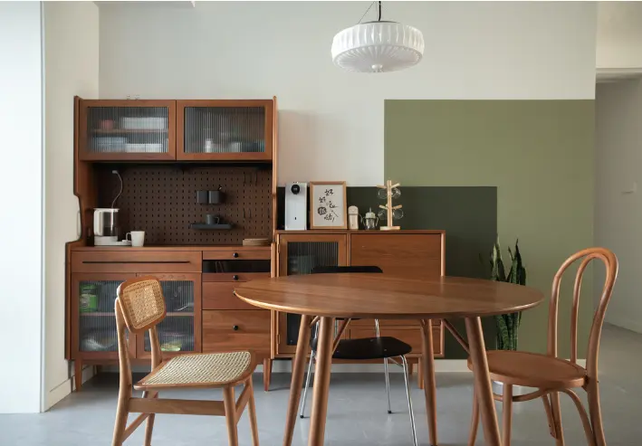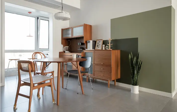 餐厅依旧将阳台打通,扩大使用面积,空间也更显通透。全套木制家具,温润的色泽,让家更有温度。圆桌的布置,让餐厅变得更有趣味性。背景墙做了色块拼涂设计,活泼氛围感拉满。