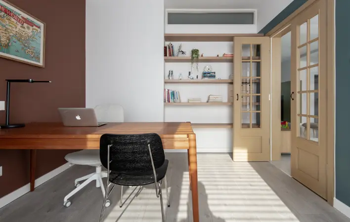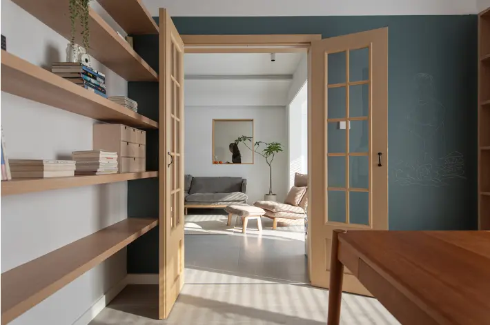 简洁耐看的电视墙,利用隔板架装饰点缀,搭配原木电视柜恰到好处。书房双开门设计,依旧是原木色调,呼应电视柜,保持同屏自然效果。