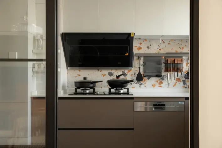 厨房拆除了一些非承重墙,全部转换成结构空间,通透又实用。橱柜和吊柜采用不同色调,视觉上形成上下分色设计,中间采用水磨石瓷砖装饰,值得装修参考。