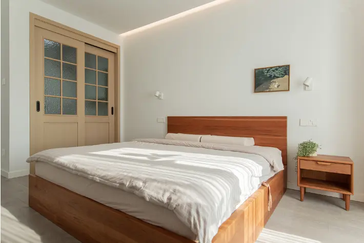 卧室选择了箱床,满足基础功能的同时,还增加了收纳,为了做好配角,卫生间选用了木色移门。