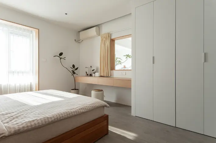 2.2米的梳妆台,悬空设计更通透。梳妆台连着衣柜,衣柜采用一门到顶的设计,极简外观造型,看着特别顺心。
