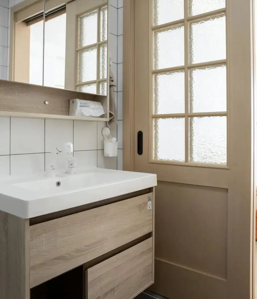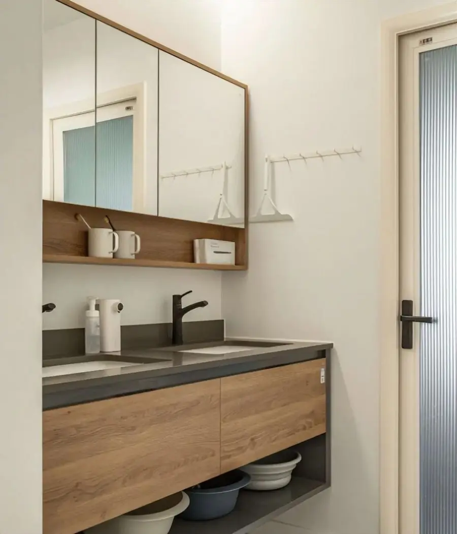 客卫做了分离式的设计,将盥洗台外移,早晚高峰期使用更舒适。双台盆设计,没有多少置物空间,于是镜柜选择了带置物架的,确保使用舒适性。