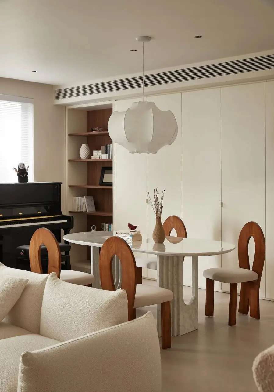▲ 餐厅位于沙发背后,大理石餐桌搭配胡桃木餐椅,丰富空间质感,上方点缀一盏蚕丝吊灯提升就餐格调,靠窗规划钢琴区