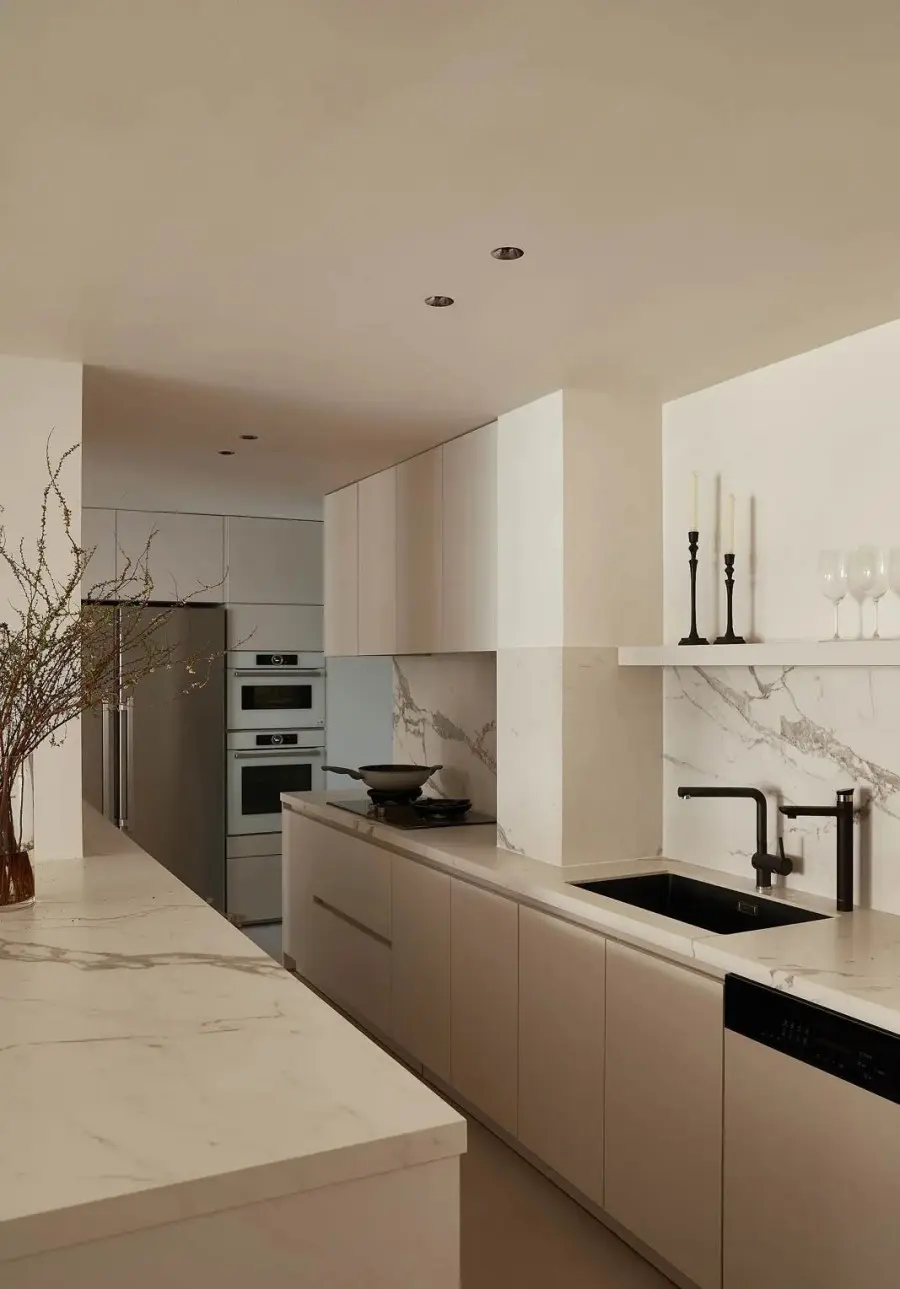▲ 灶台设置在承重柱背后,搭配隐藏式油烟机,保持视线的整洁清爽,收纳柜从餐厅延续至厨房,将冰箱以及蒸烤箱嵌入其中