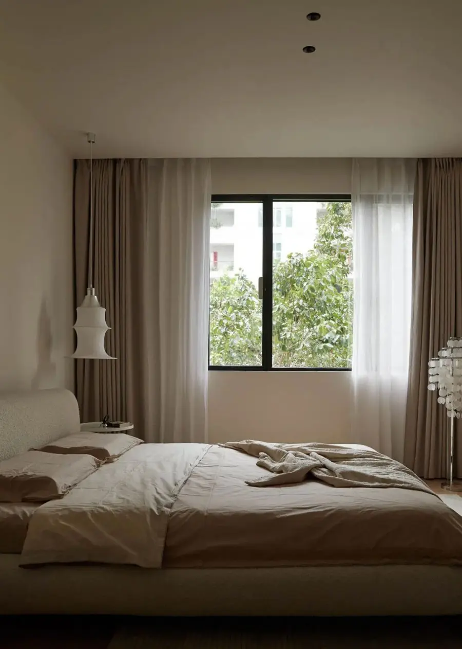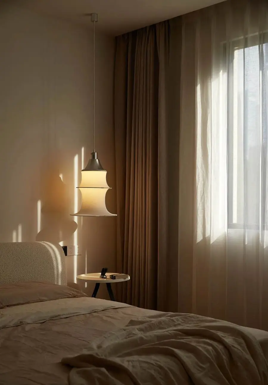 ▲ 竹节吊灯温馨有格调,布艺窗帘透着柔情光影,慵懒舒适氛围萦绕整个卧室