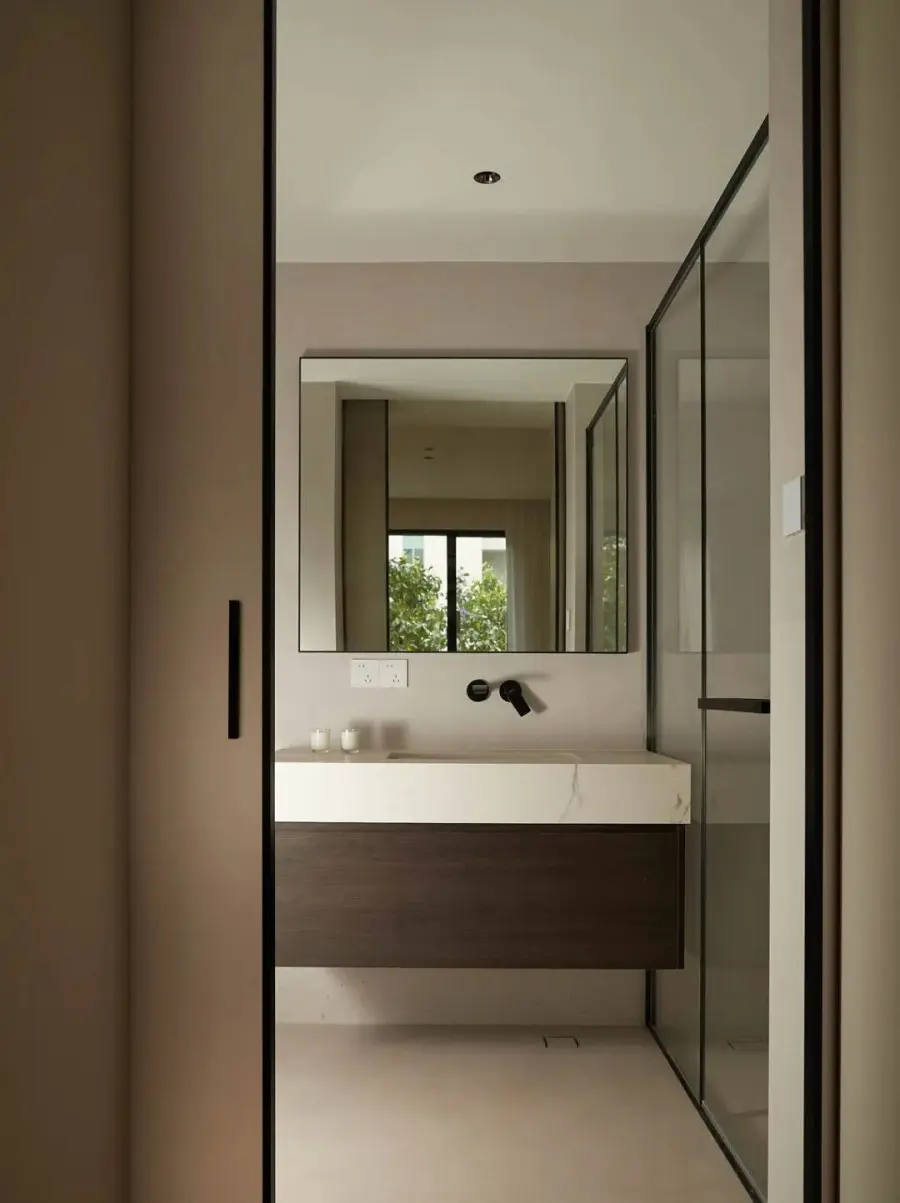 ▲ 口袋门隔断主卫空间,悬空洗漱台居中,两侧分布着马桶区和淋浴区